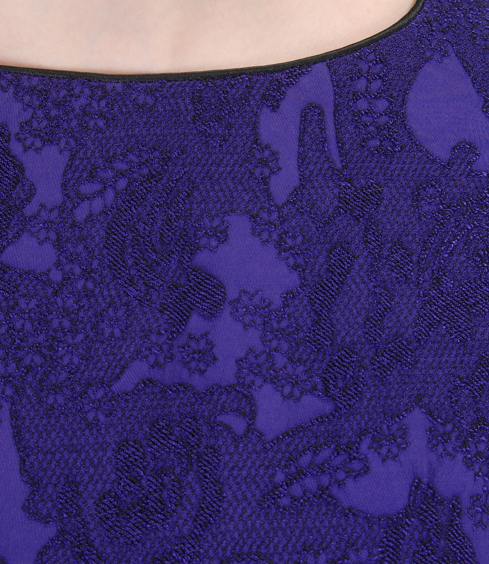 Elastic brocade dress, slightly flaring, with trimmings on the neckline and at sleeves termination. It closes with a hidden zipper on the left side.