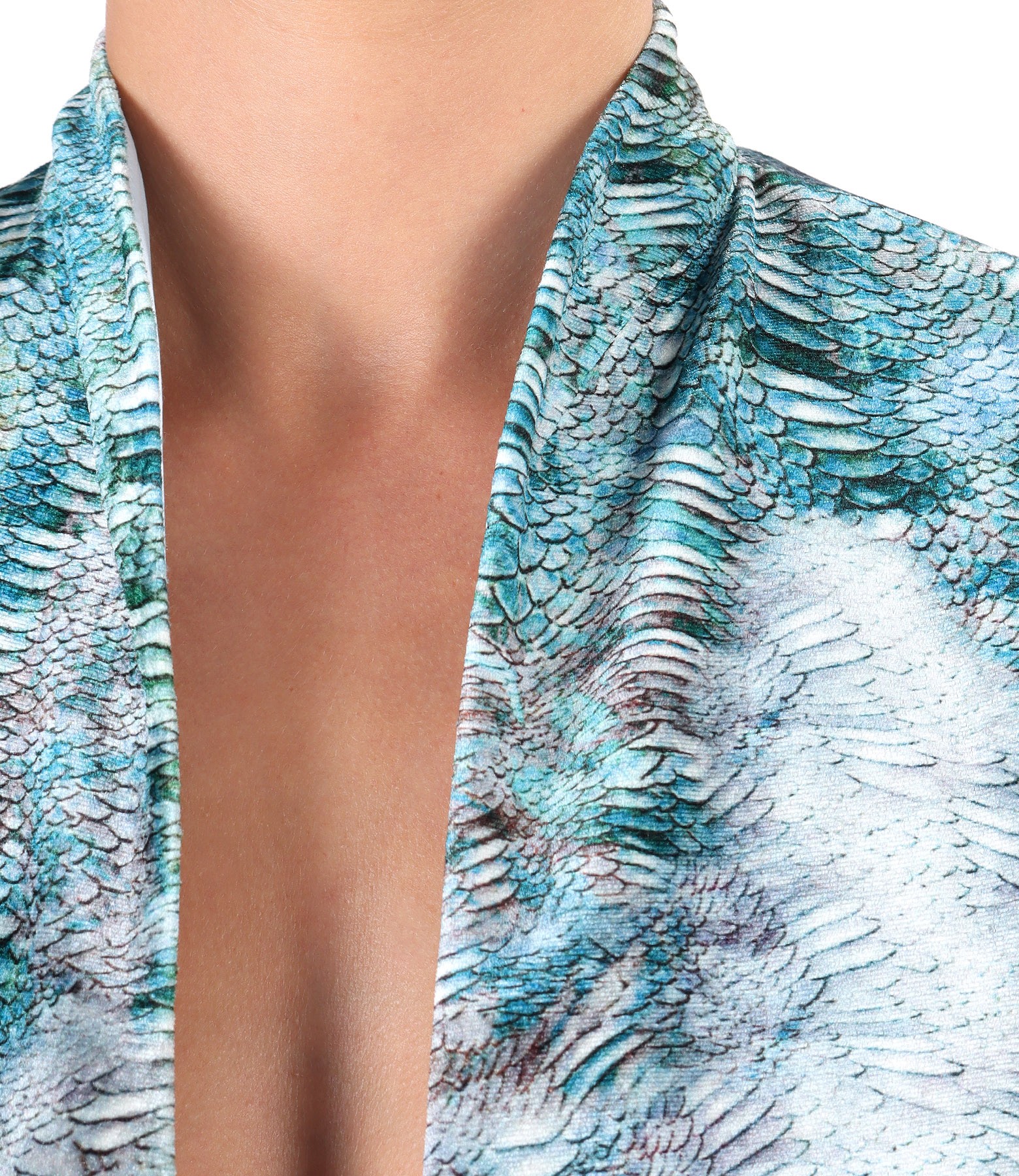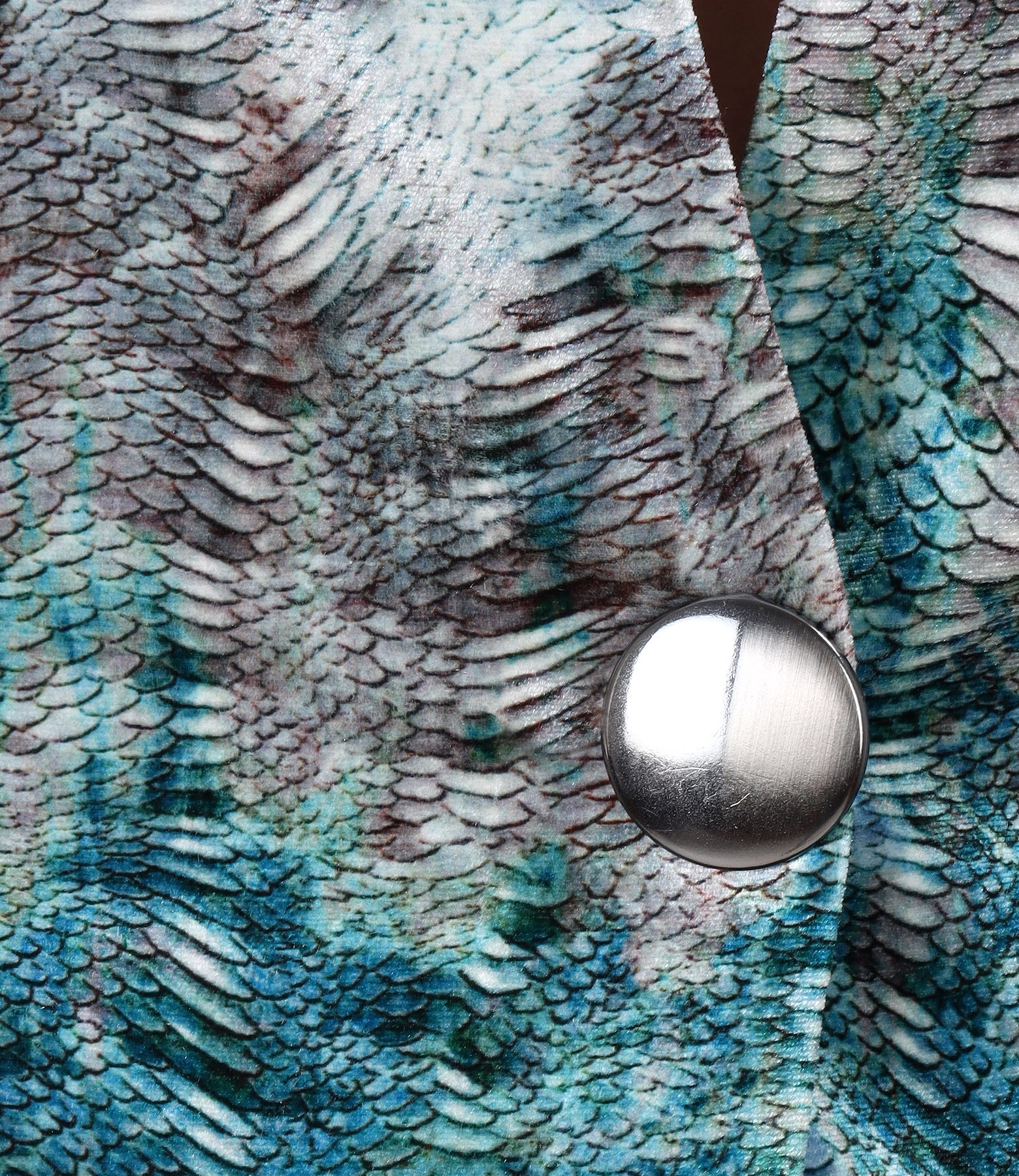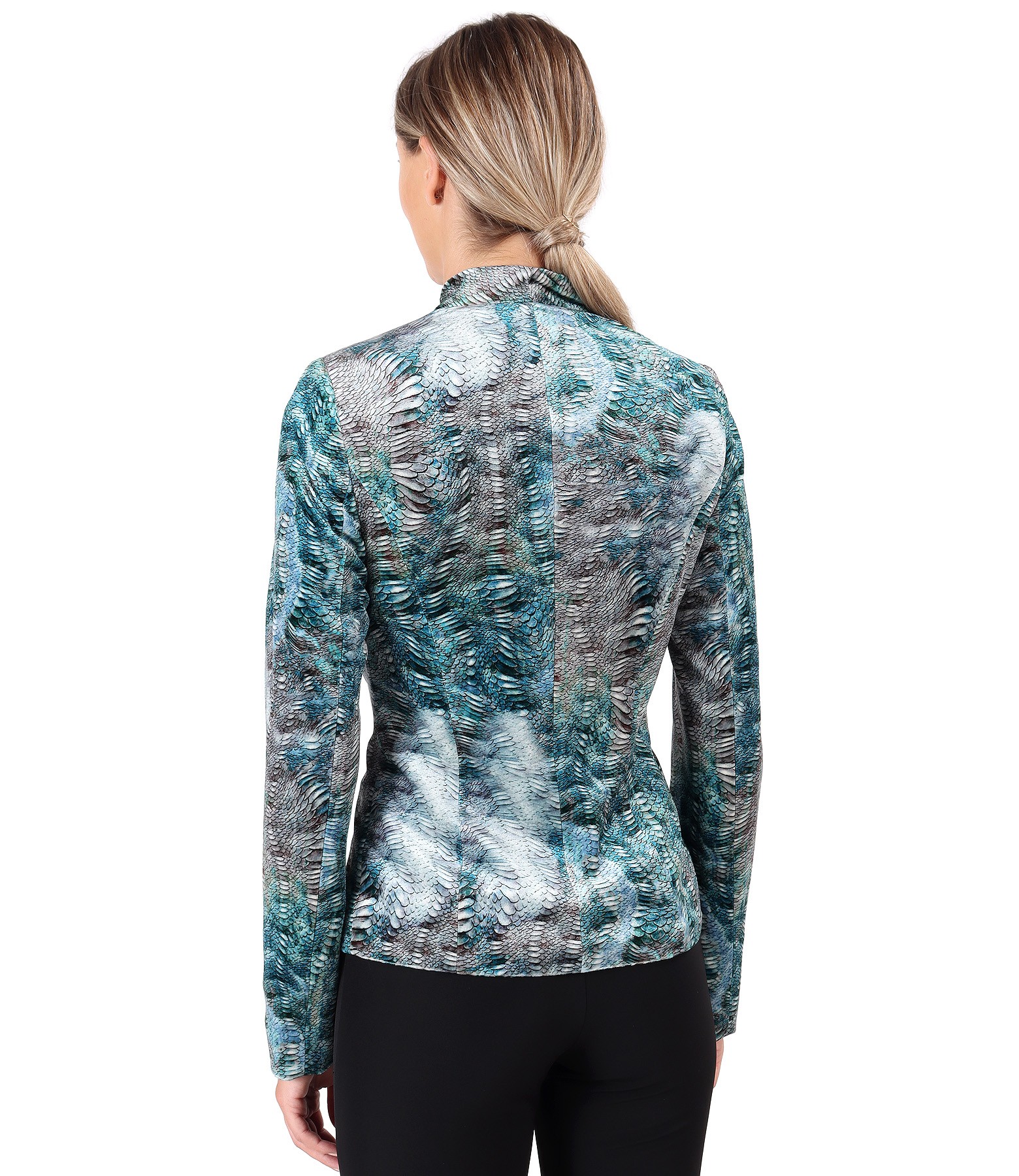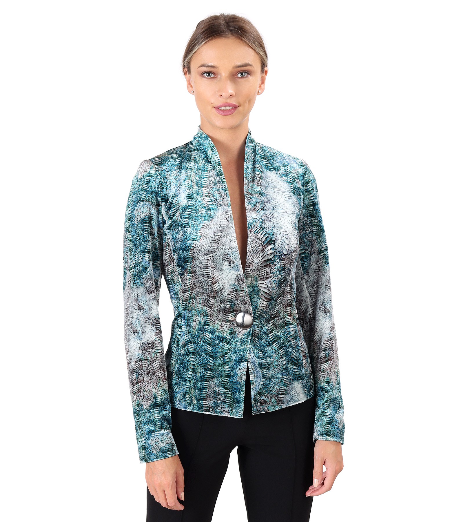 Elastic velvet jacket with animal print, padded, with collar tunic and deep neckline. Closes with a button on the face.