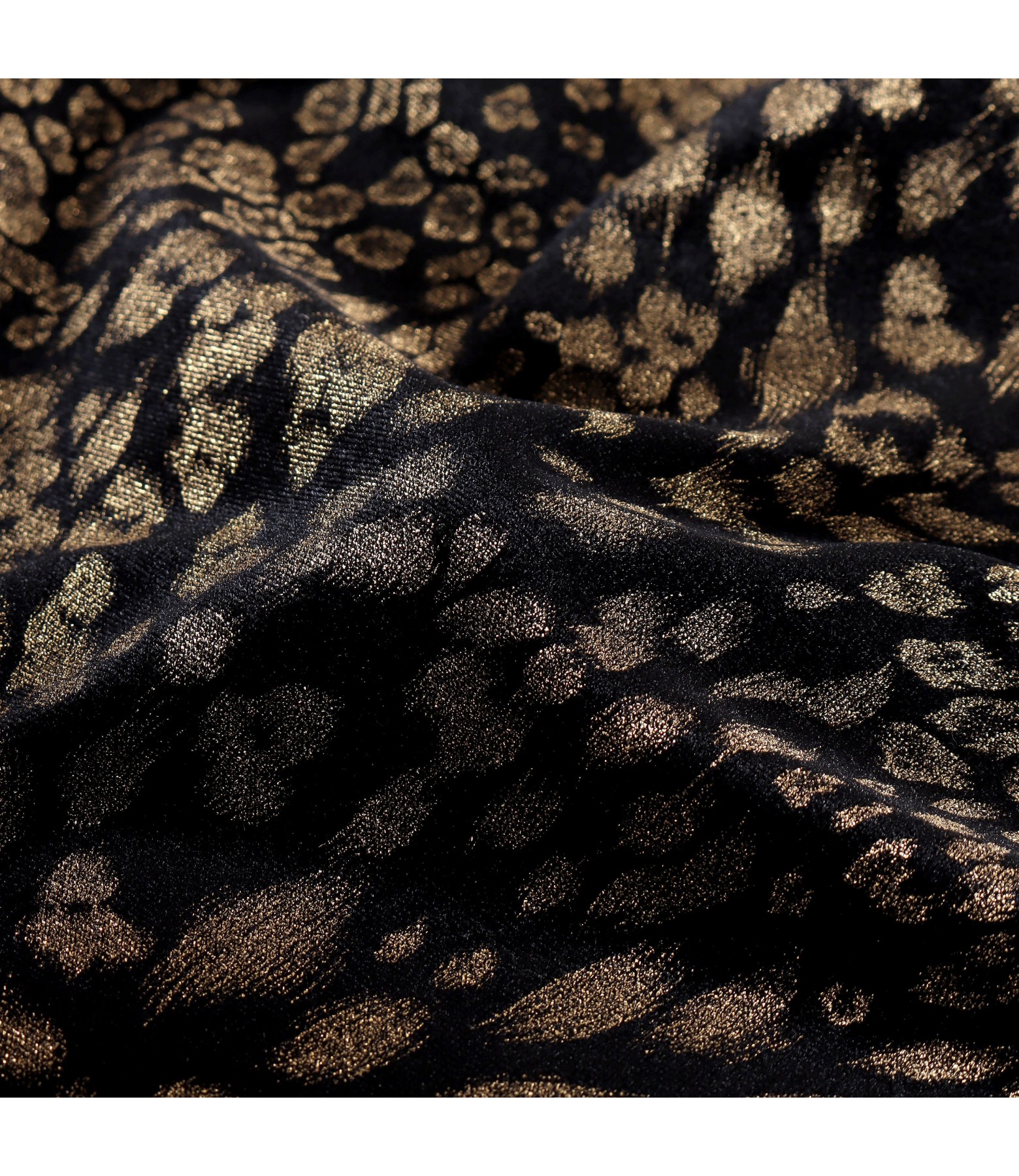 Elastic velvet dress printed with golden motifs, padded, with long sleeves, round decolletage with a detachable brooch. Closes with a hidden zipper on the middle back.