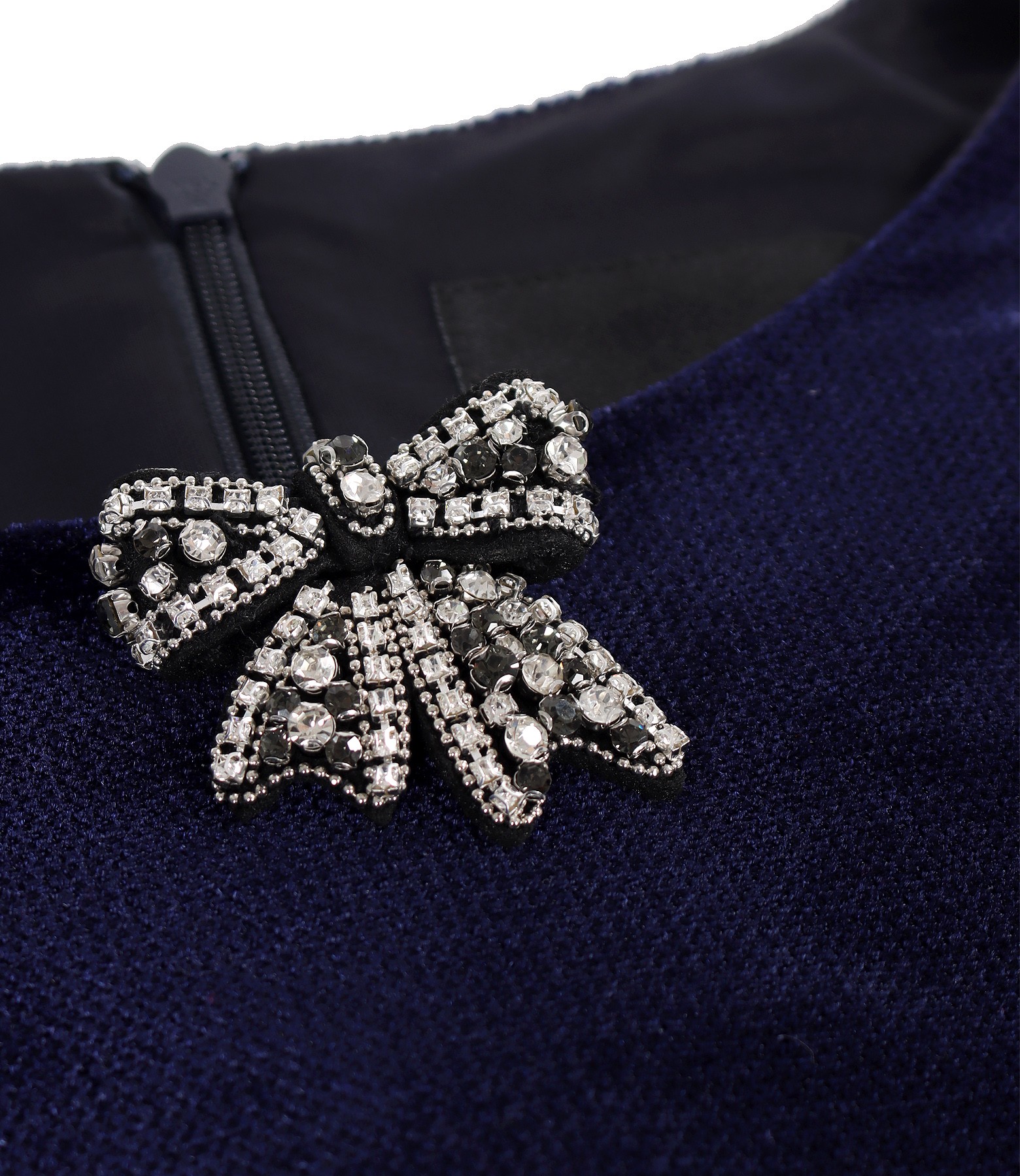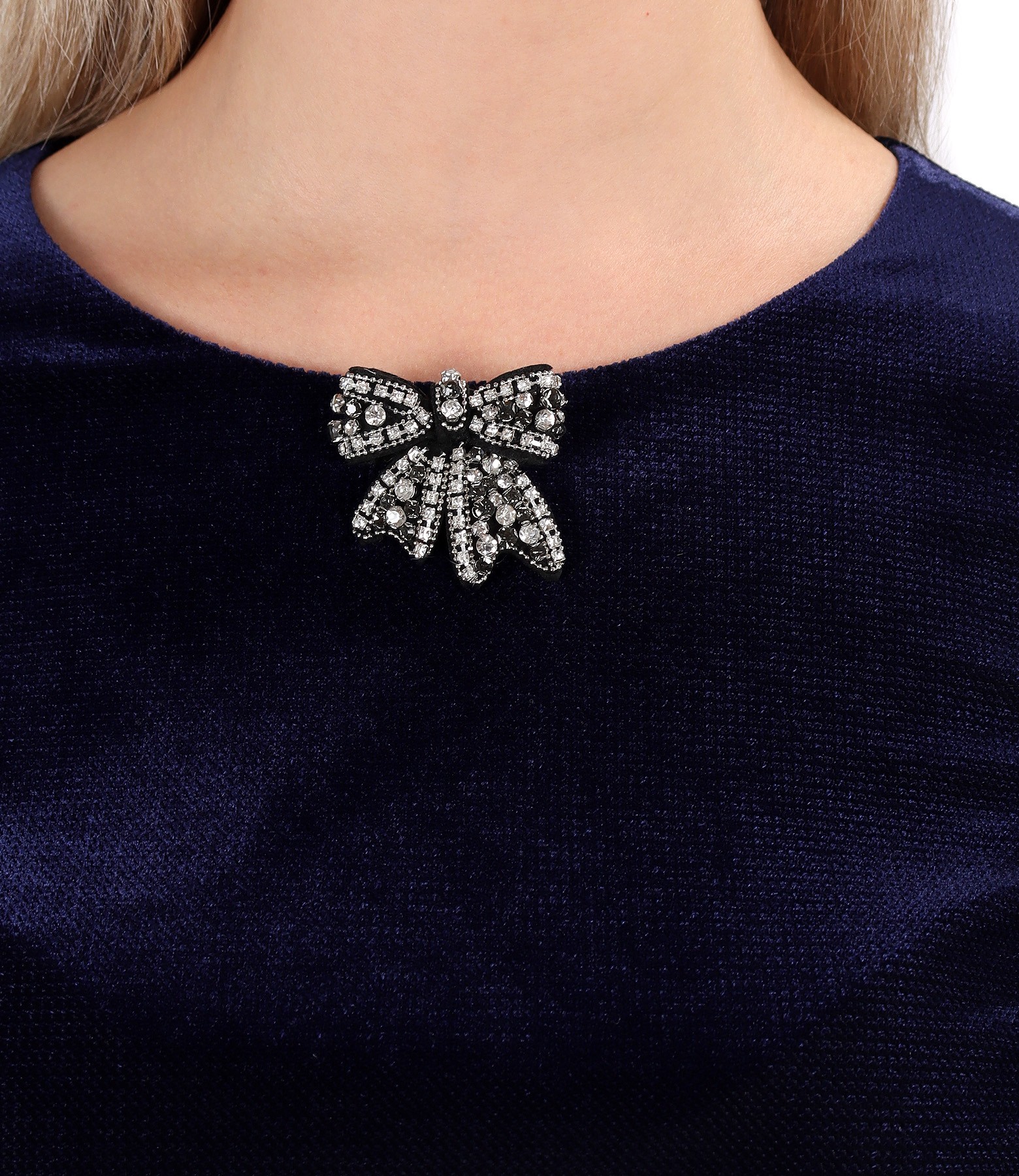 Elegant elastic velvet dress, padded, with long sleeves and round decolletage with a detachable brooch. Closes with a hidden zipper on the middle back.