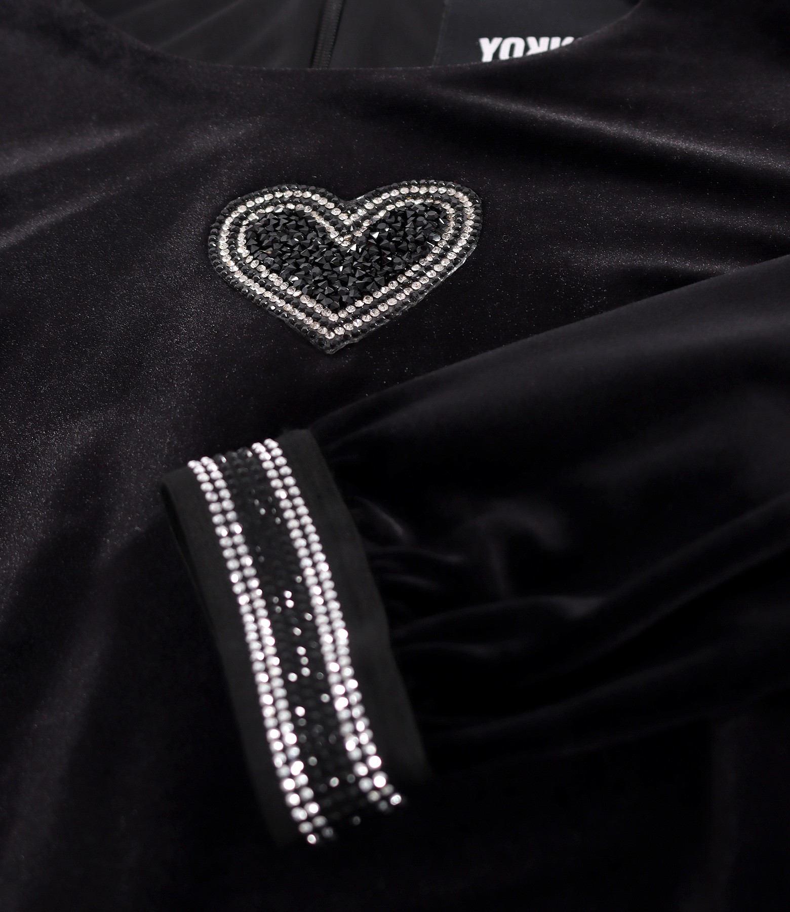 Dress made of elastic velvet, with a frill at the hem, long sleeves with elastic with crystals, round neckline with heart-shaped crystals applied. It closes with a hidden zipper in the middle of the back.
