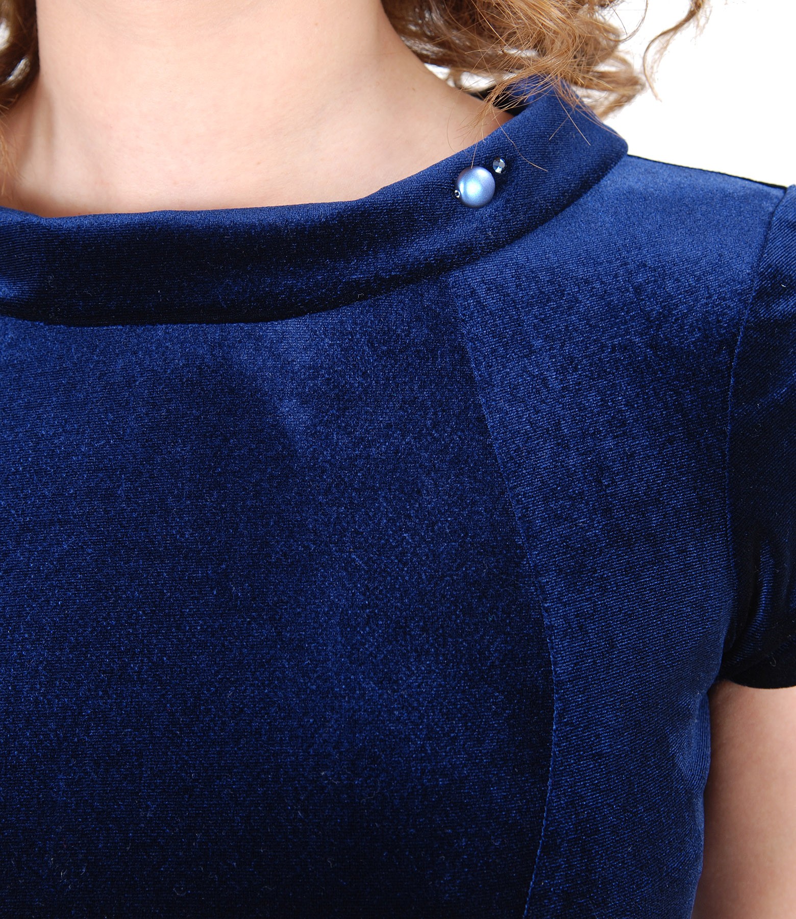 Elastic velvet dress, lined, with short sleeves and round collar embellished with crystals. Closes with hidden zipper on the middle back.