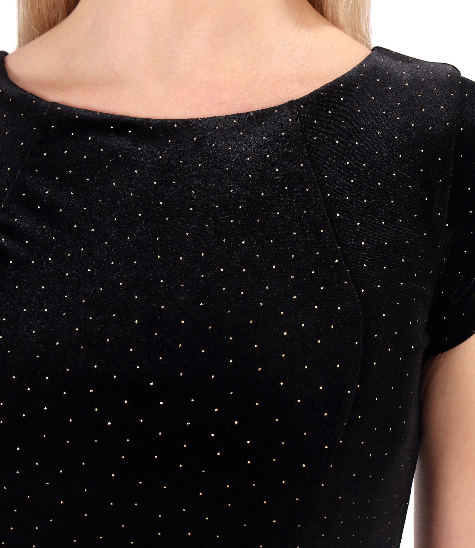 Black elastic velvet dress with gold polka dots, padded, round neckline and short sleeves. It closes with a hidden zipper in the middle of the back.