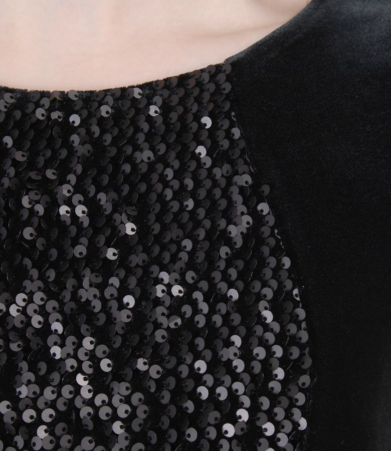 Black elastic velvet dress, with round neckline and short sleeves. Black matte sequins insertion on middle-front. Closes with middle-back concealed zipper.