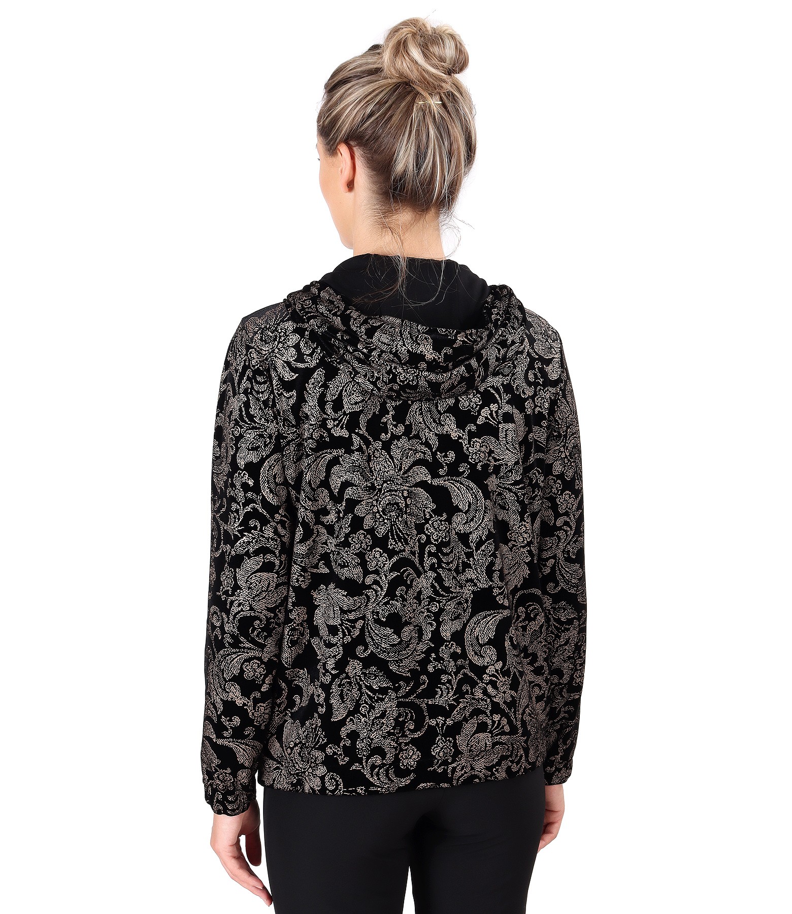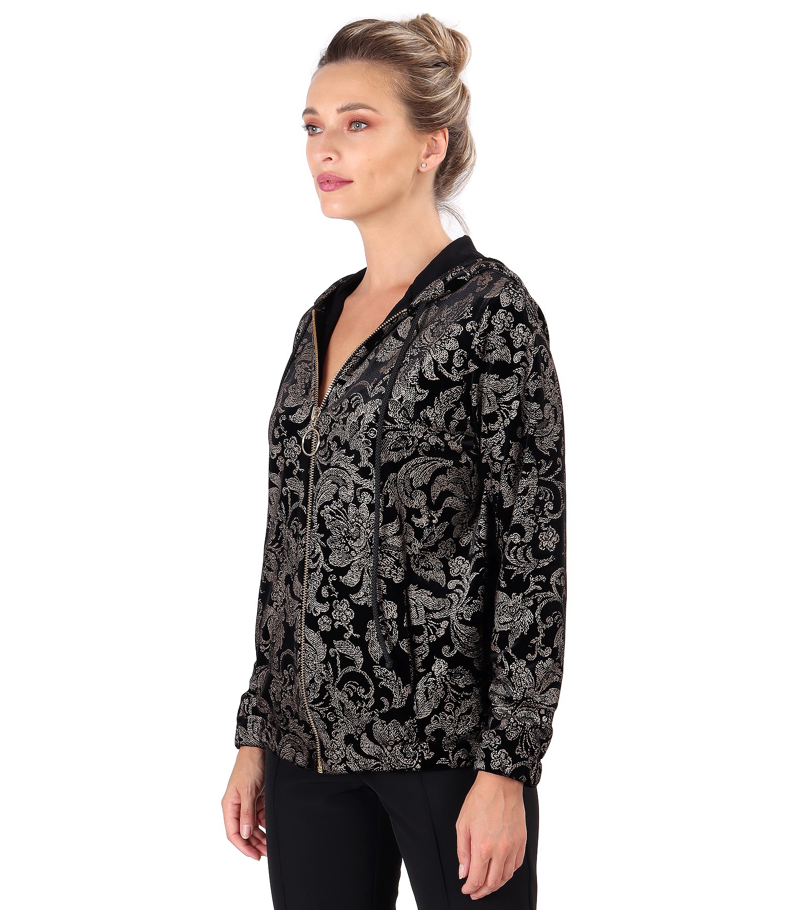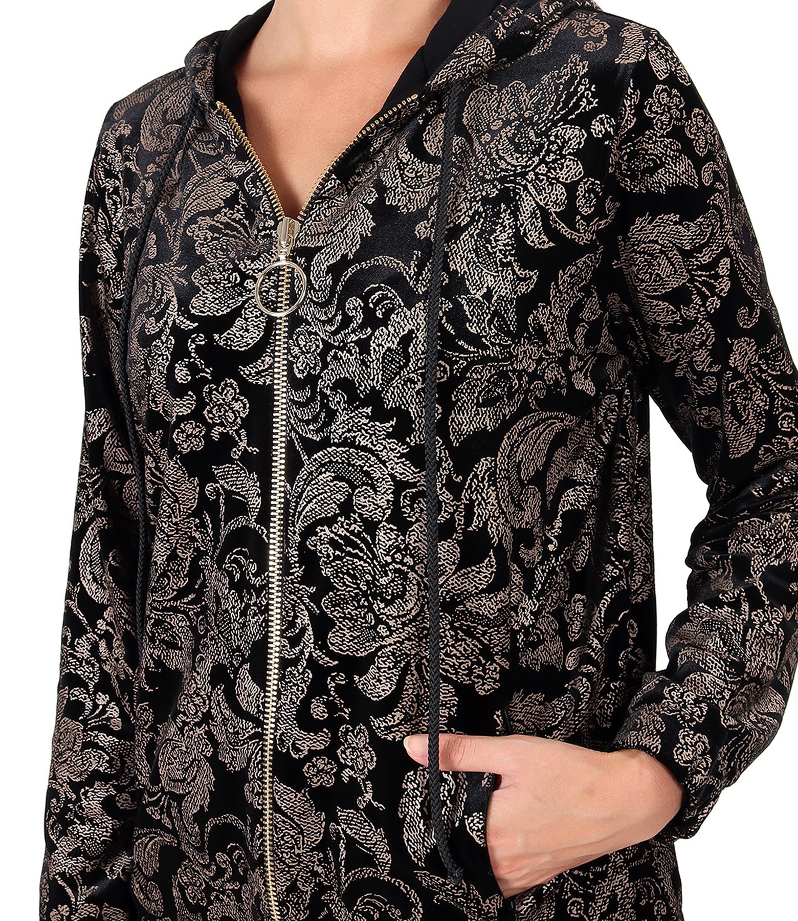 Elastic velvet hoodie printed with gold motifs, lined, with hood with laces and side pockets. It closes with a metal zipper in the middle of the front.