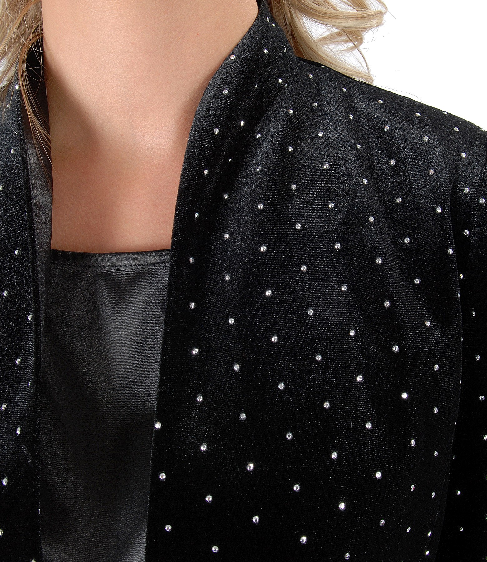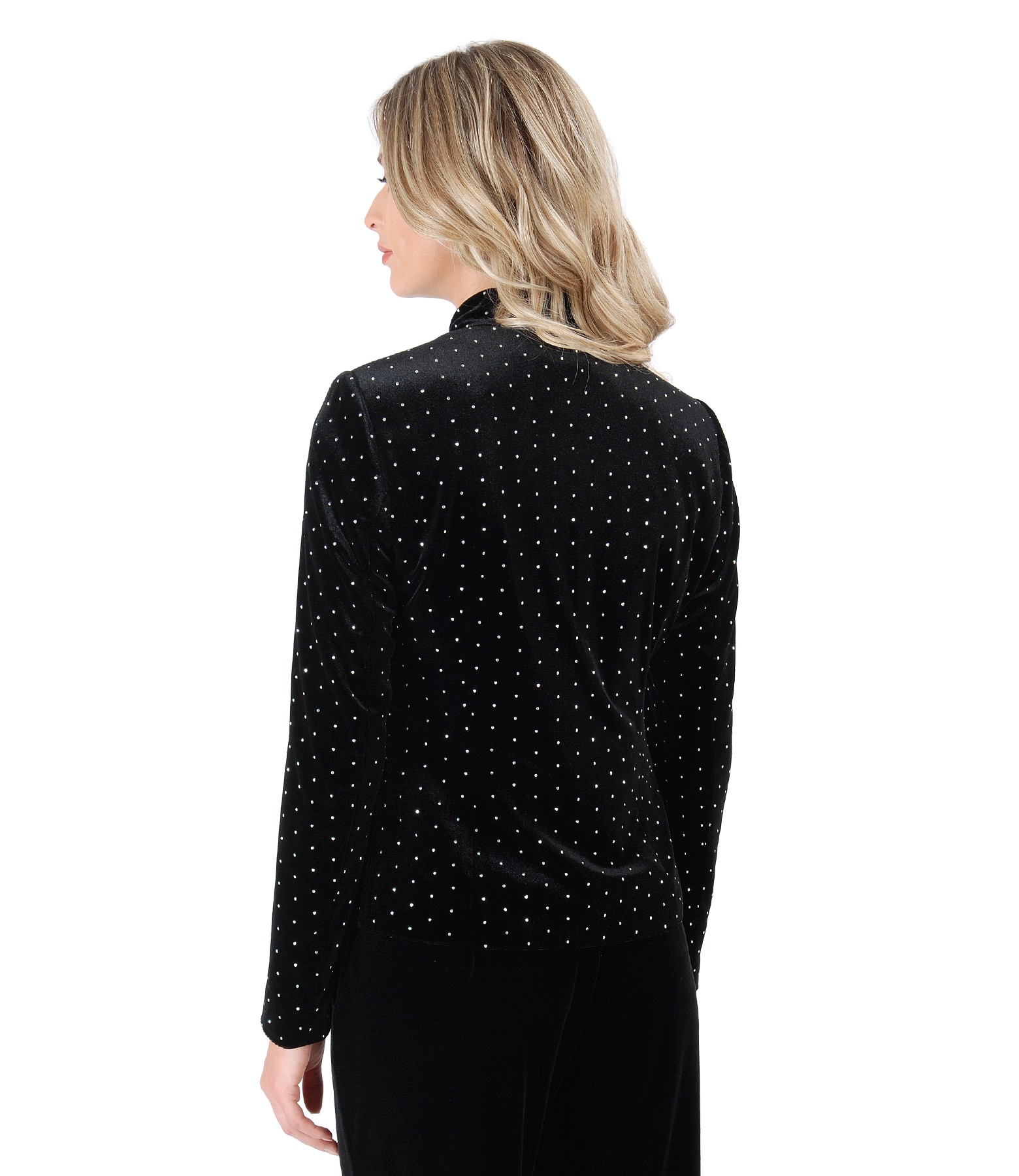 Elastic velvet jacket with metallic inserts, padded, with tunic collar and deep low-cut neck. Closes with a front button.