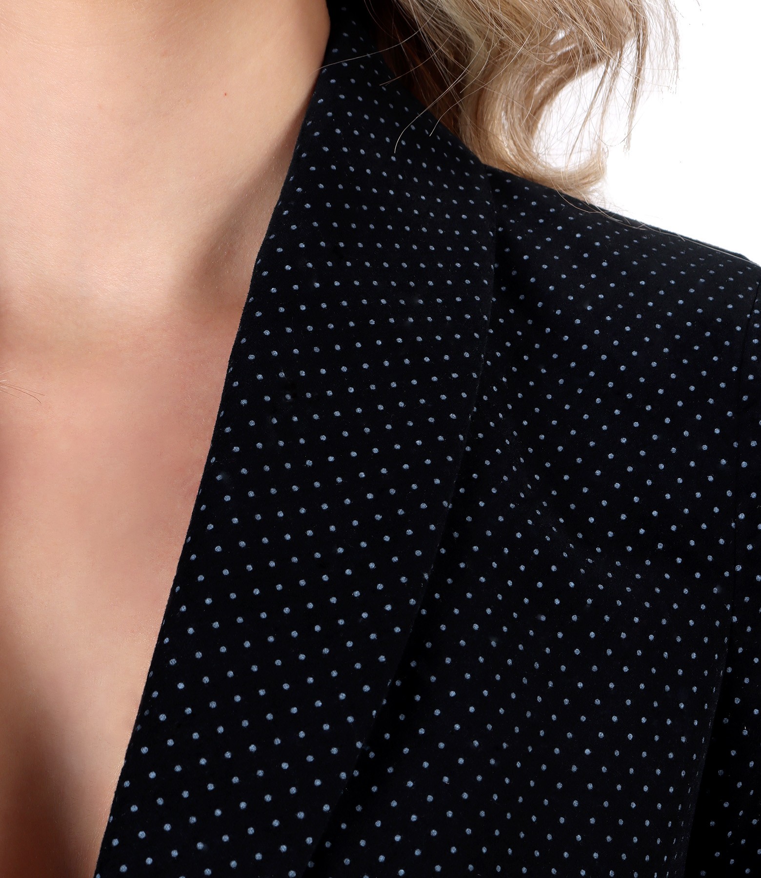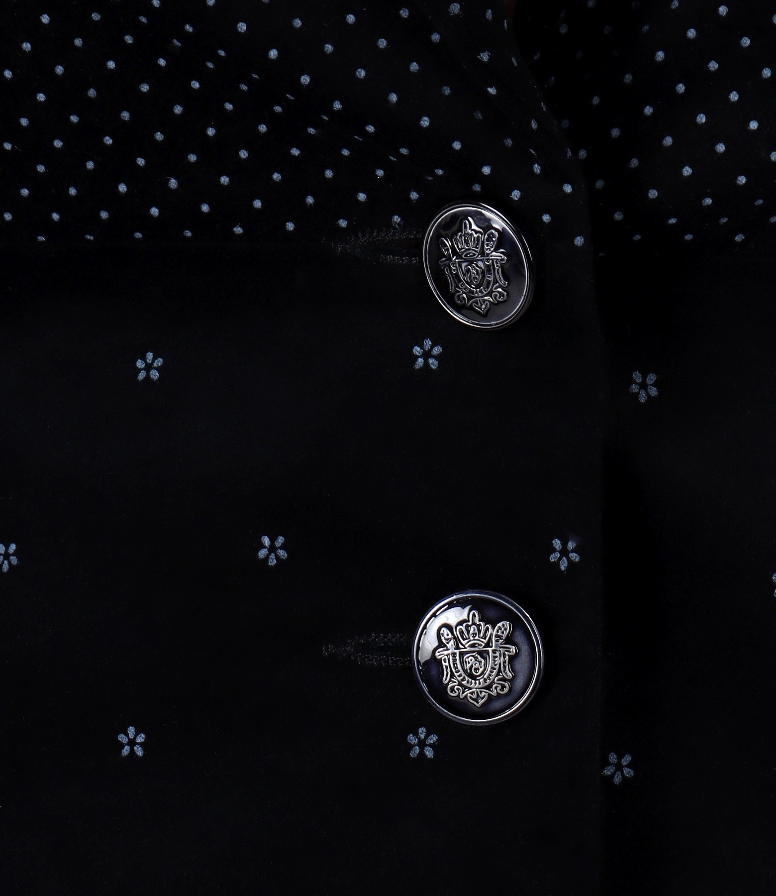 Two kind of jacket made of printed cotton velvet, padded, with scarf collar, cut at the waist.It closes with 4 buttons on the face.