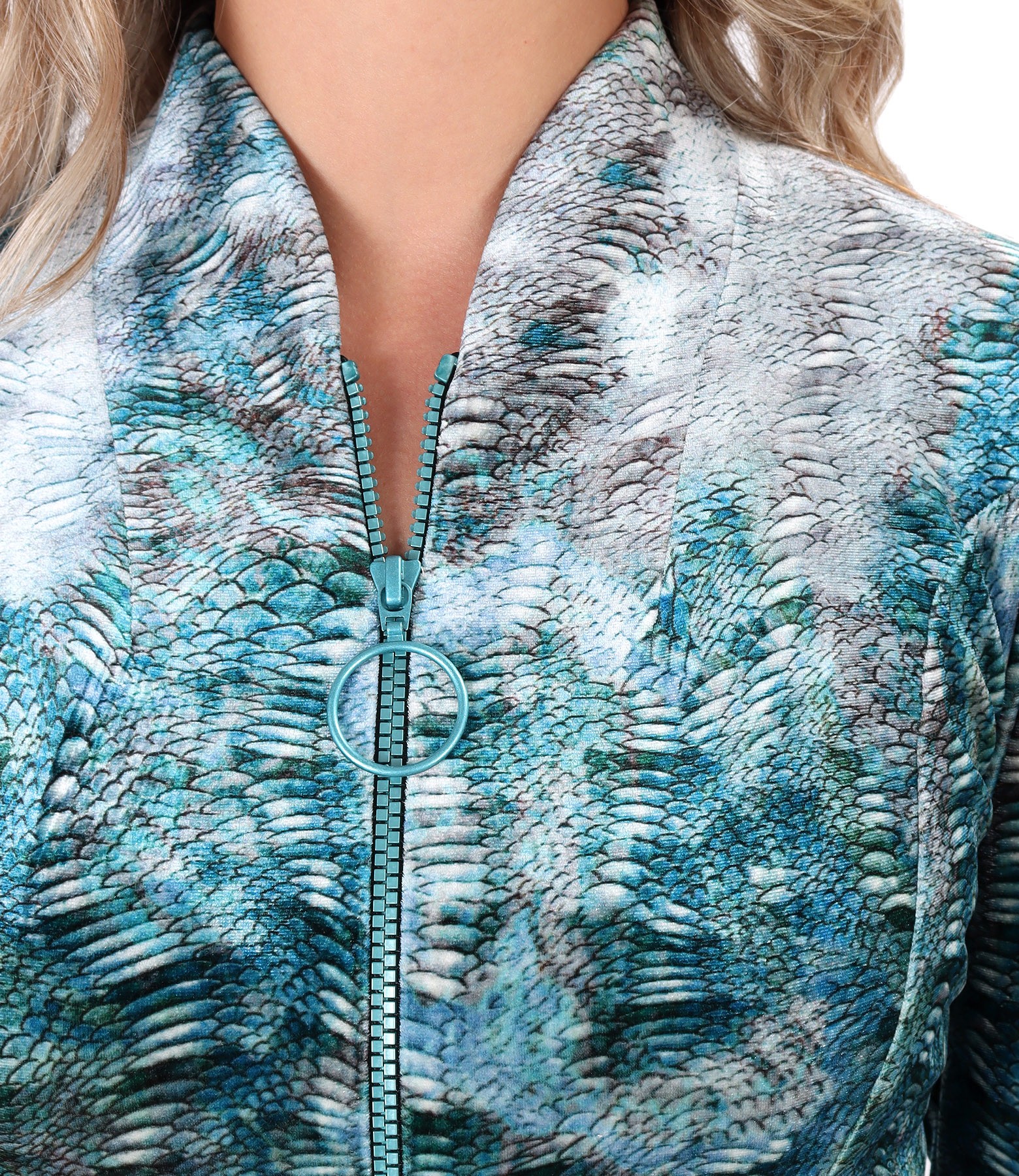 Printed elastic velvet midi dress, padded, with zipper with double opening in the middle of the front, long sleeves and tunic collar.