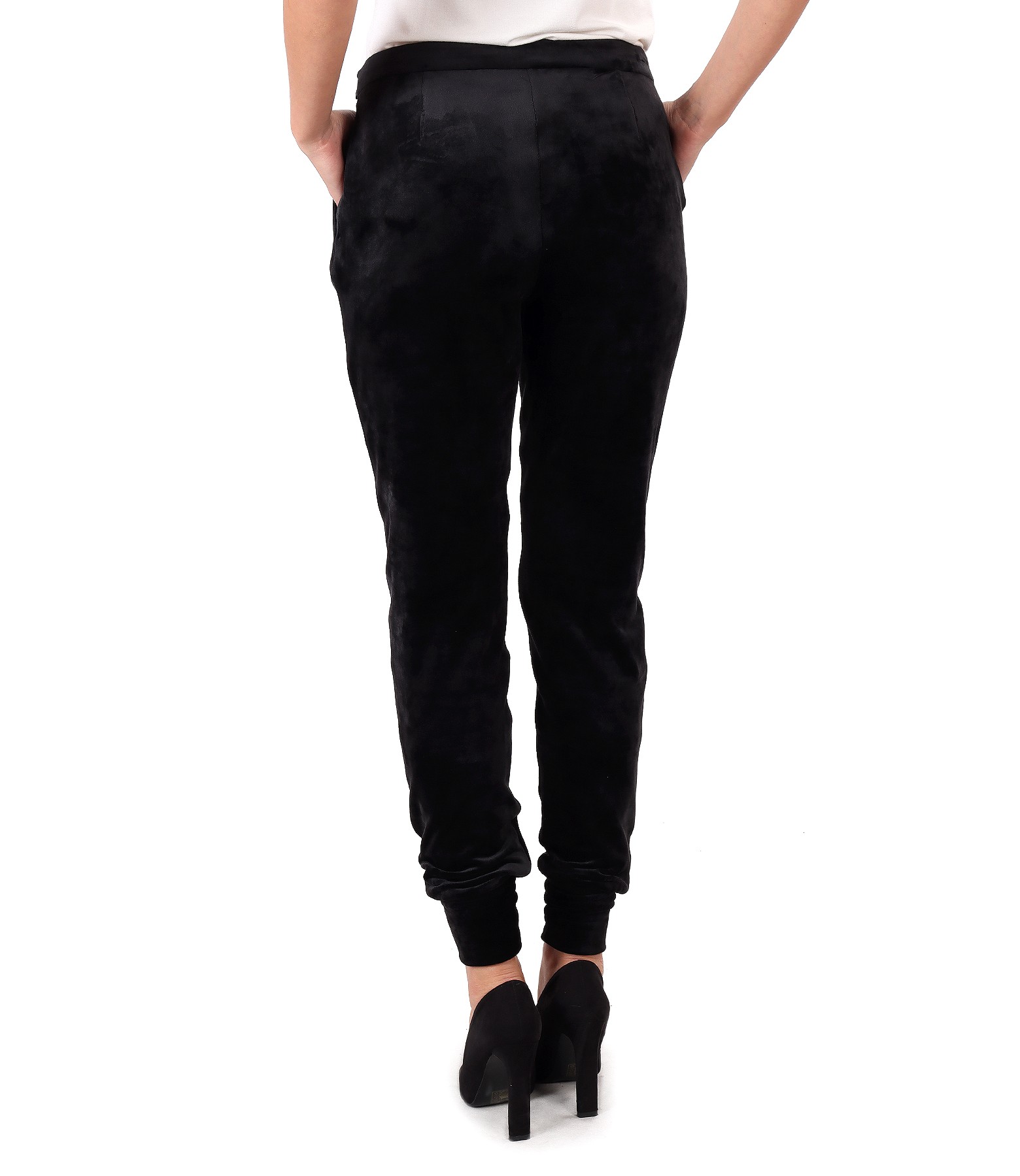 Black elastic velvet pants, with waist cord, side folds on the front and 2 oblique side pockets. Closes with a hidden zipper on the left side.