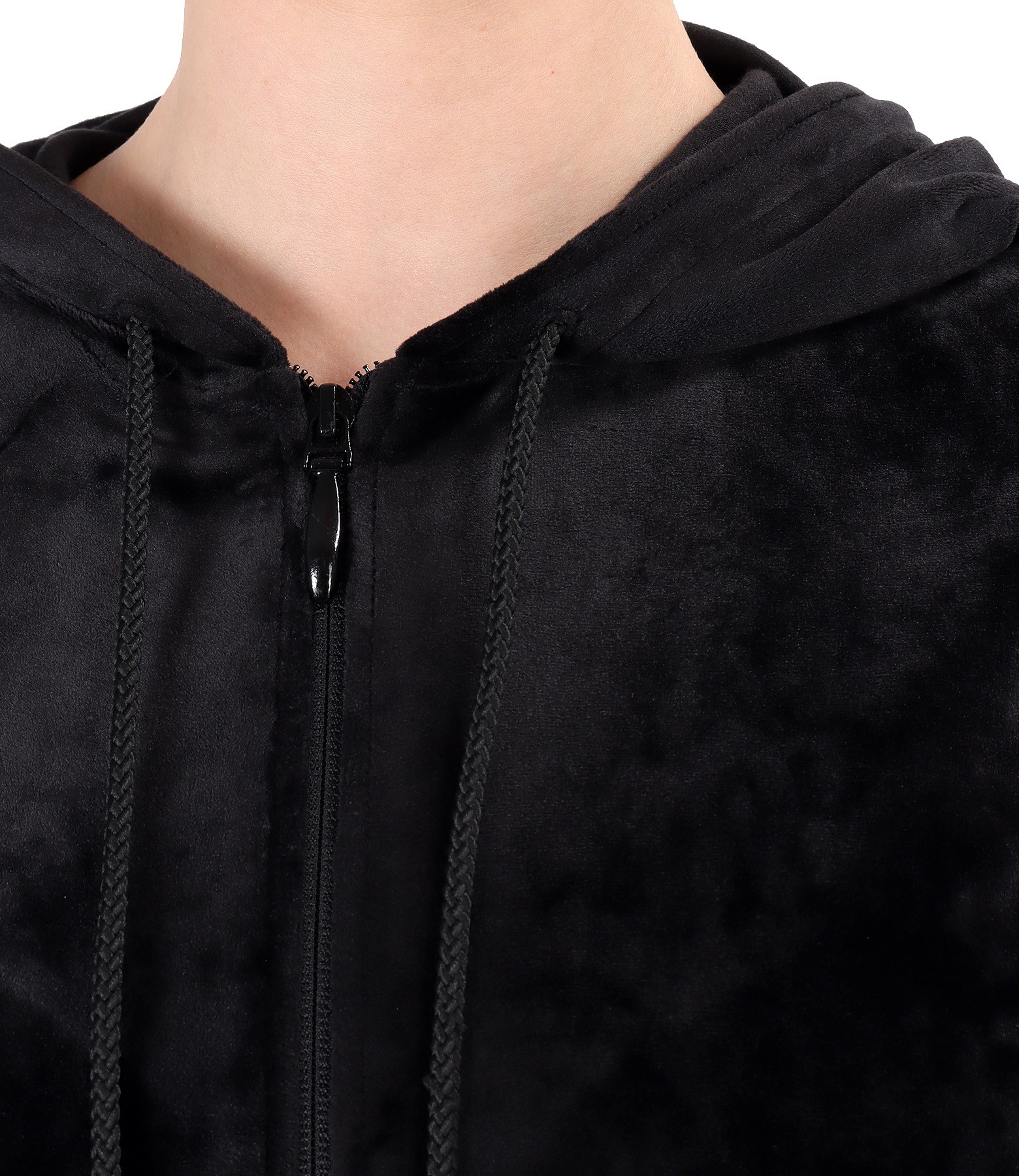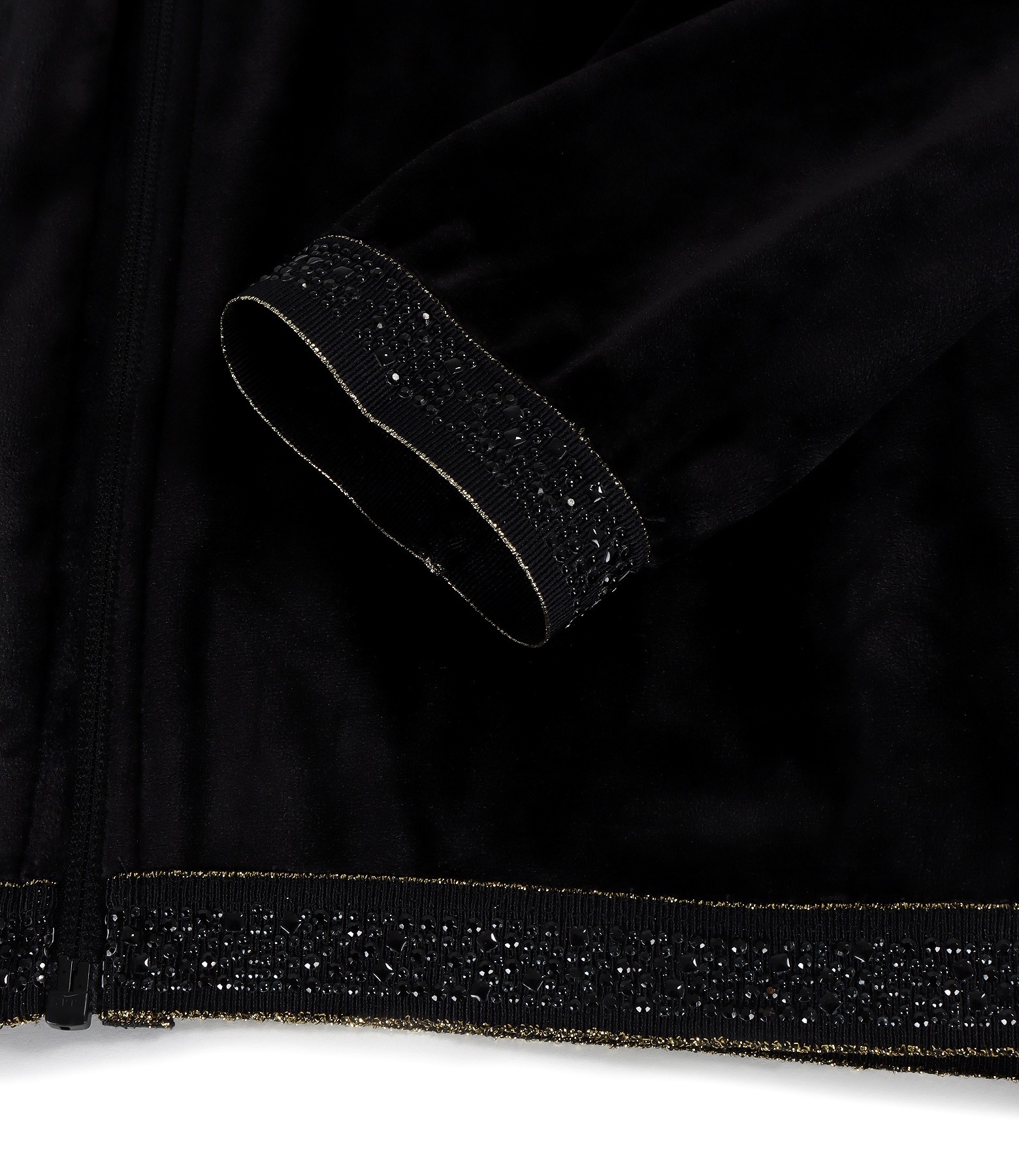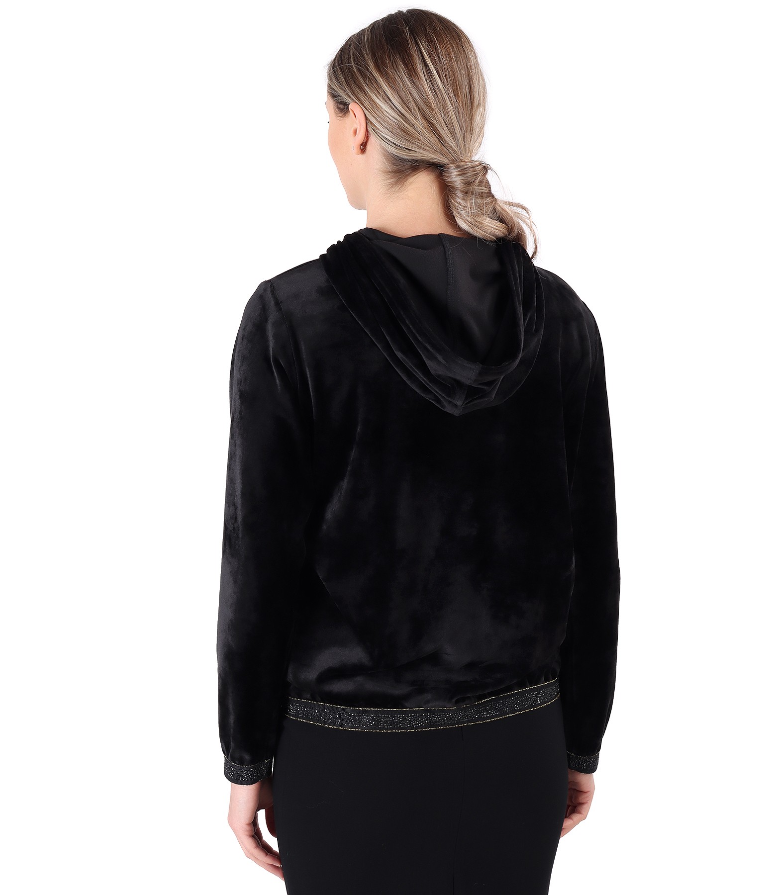Elastic velvet sweatshirt, unlined, with hood with laces, with elastic finish with crystals and side pockets. Closes with a zipper in the middle of the front.