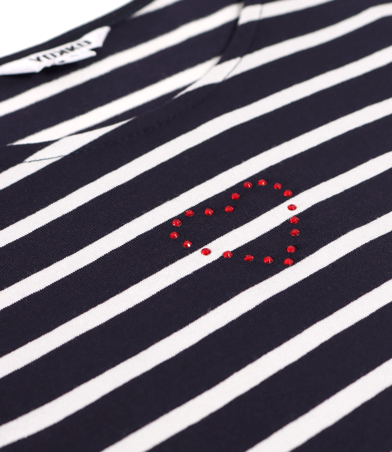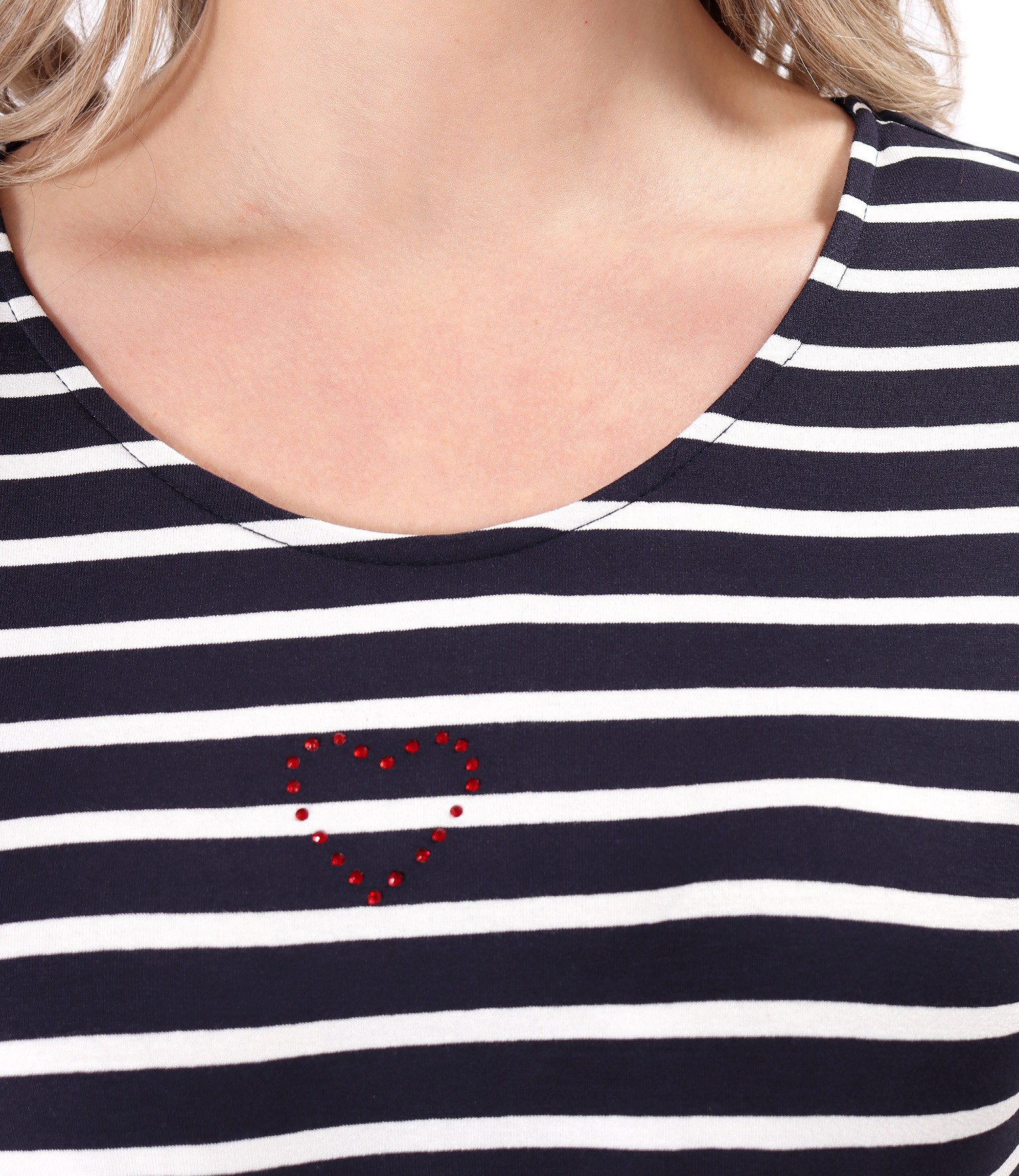 Viscose elastic jersey dress with stripes, unlined, with side pockets, round neckline with decorative heart-shaped appliqué and elastic waist. It has no closing system.