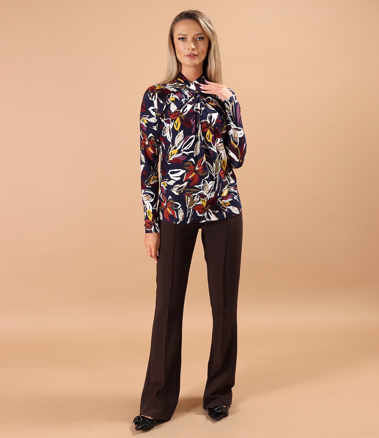 Blouse made of elastic viscose jersey printed with floral motifs, featuring pleats at the neckline and long sleeves. It fastens with two buttons at the center back.