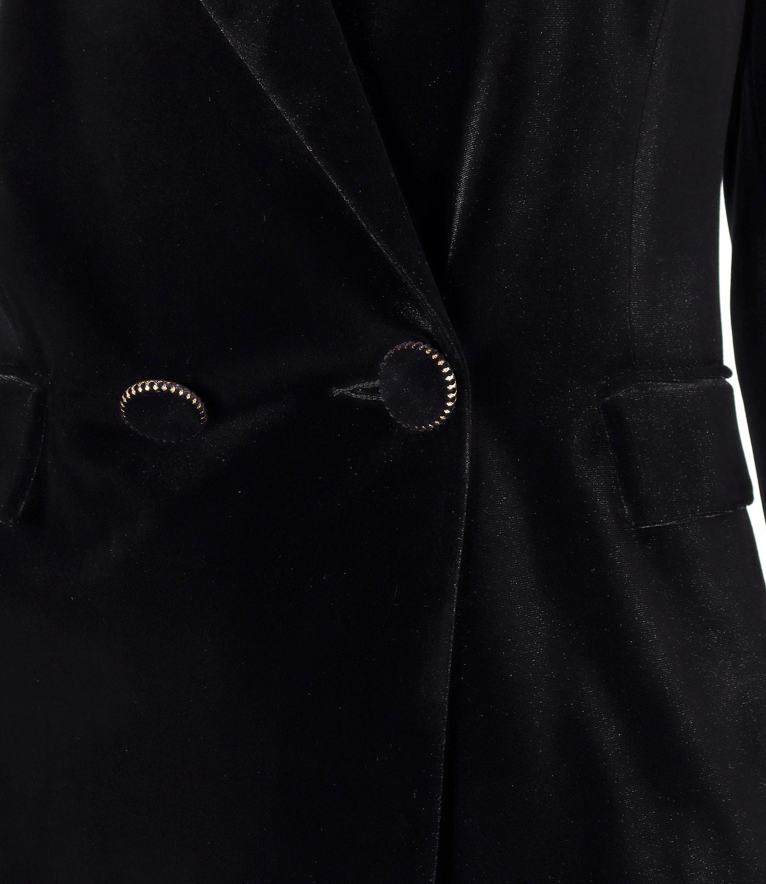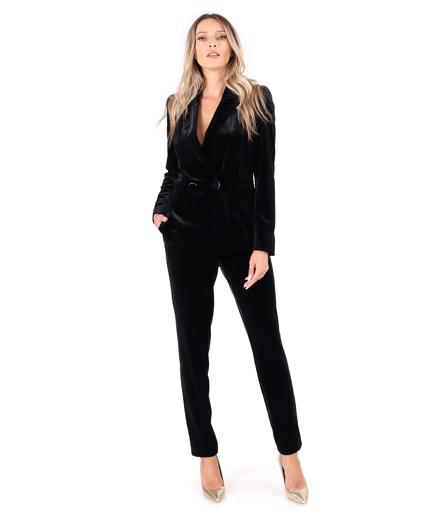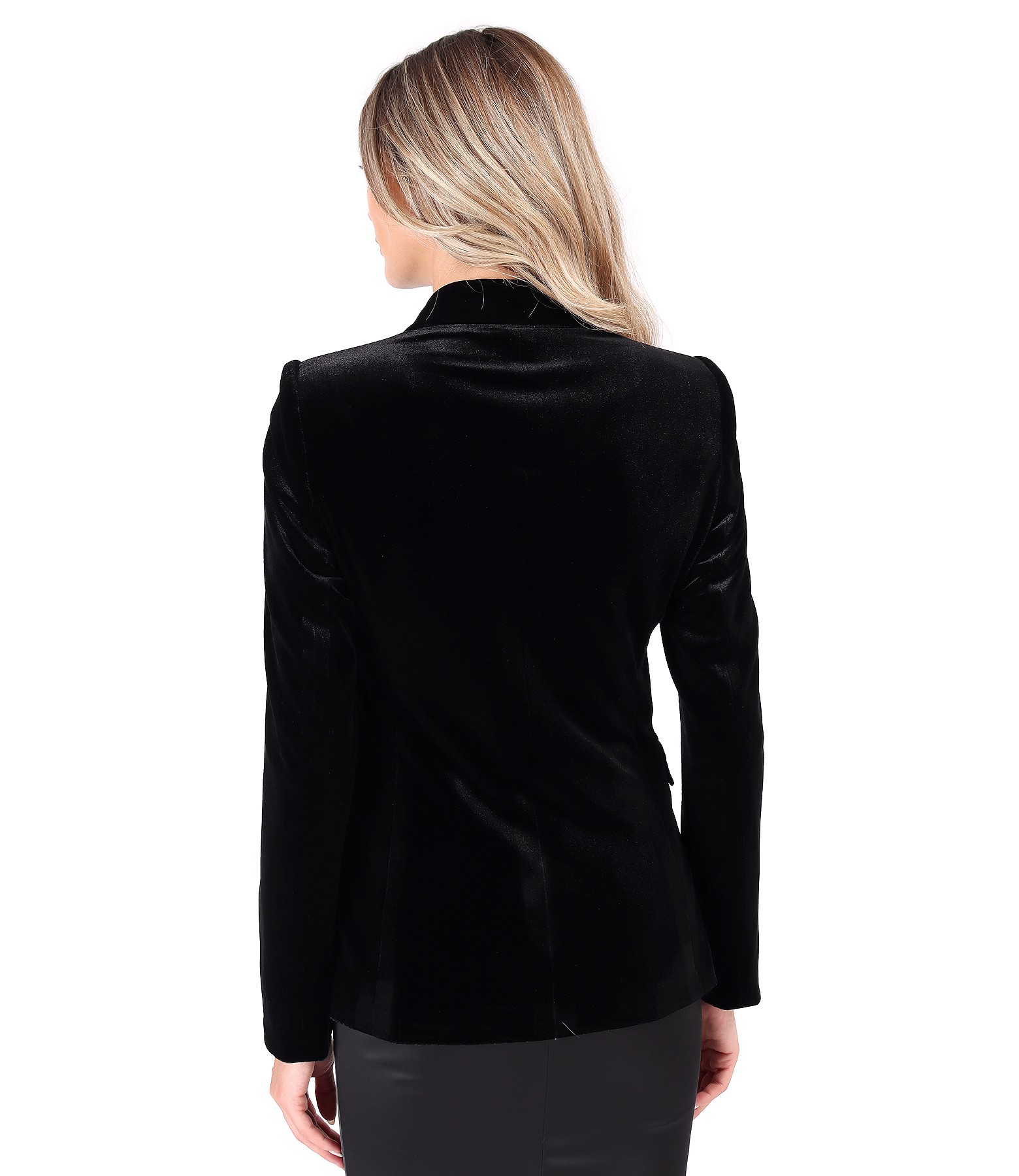 Elegant jacket made of black elastic velvet, padded, with collar and lapels. It closes with 1 button and a counter button.