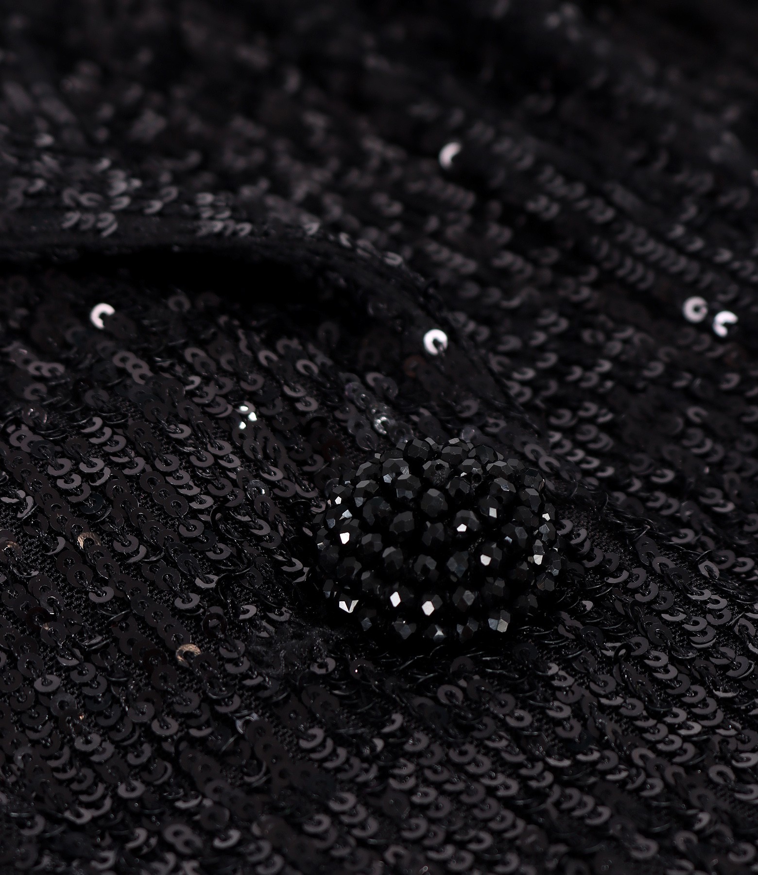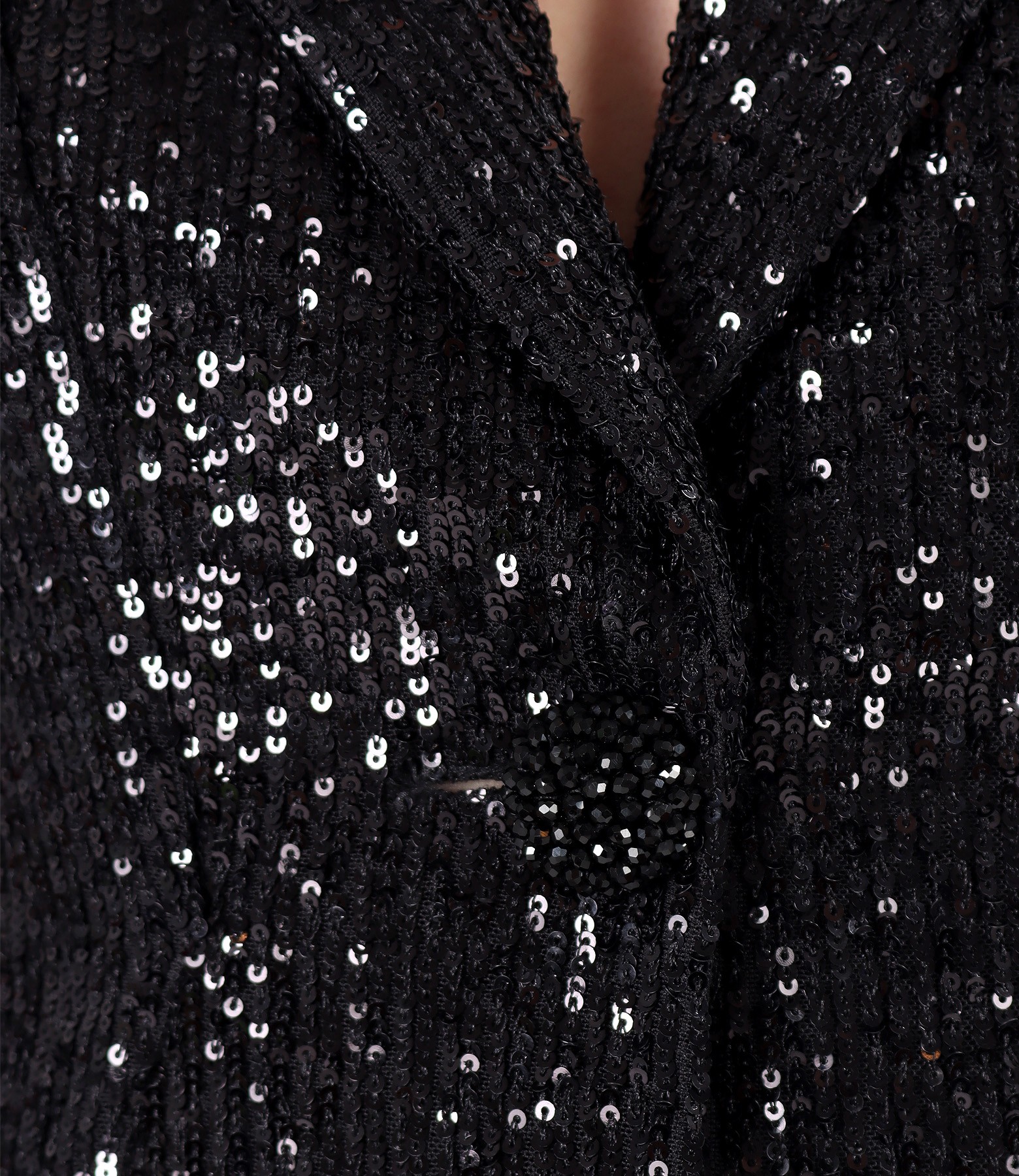 Elegant sequin jacket, padded with satin, with deep neckline. It closes with a button on the face.