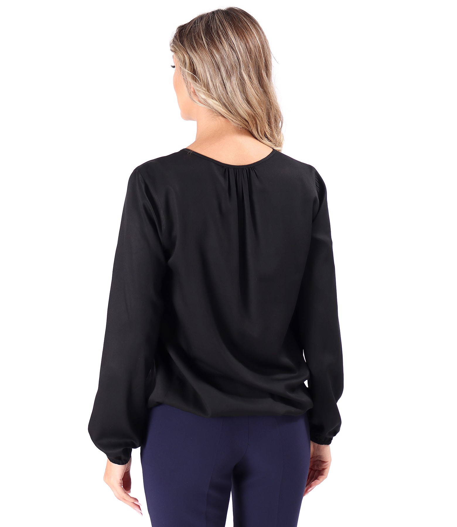 Elegant blouse made of satin-finish viscose, featuring long elasticated sleeves with elastic cuffs, a round neckline with a closed V detail at the front secured by a clasp, and crystal embellishments.