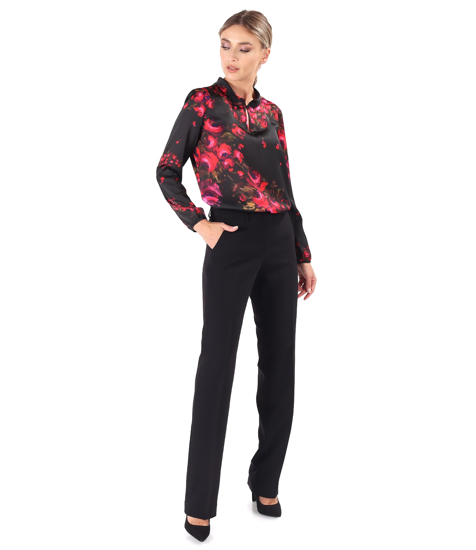 Elegant blouse, made of satin printed with floral motifs, long sleeves with elastic at the end, a pleat in the middle of the back, and a round neckline with a closed V on the front with a button.