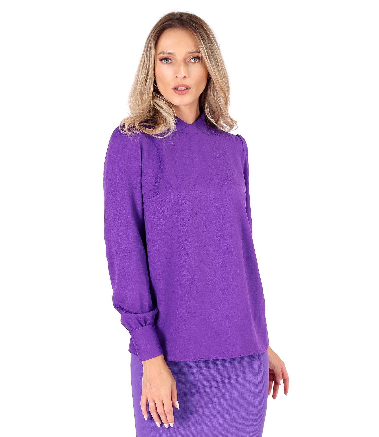Elegant viscose blouse with tone-on-tone woven paisley motifs, with collar, overlapped on the front and long sleeves with 3 button cuffs. It closes with a zipper in the middle of the back.