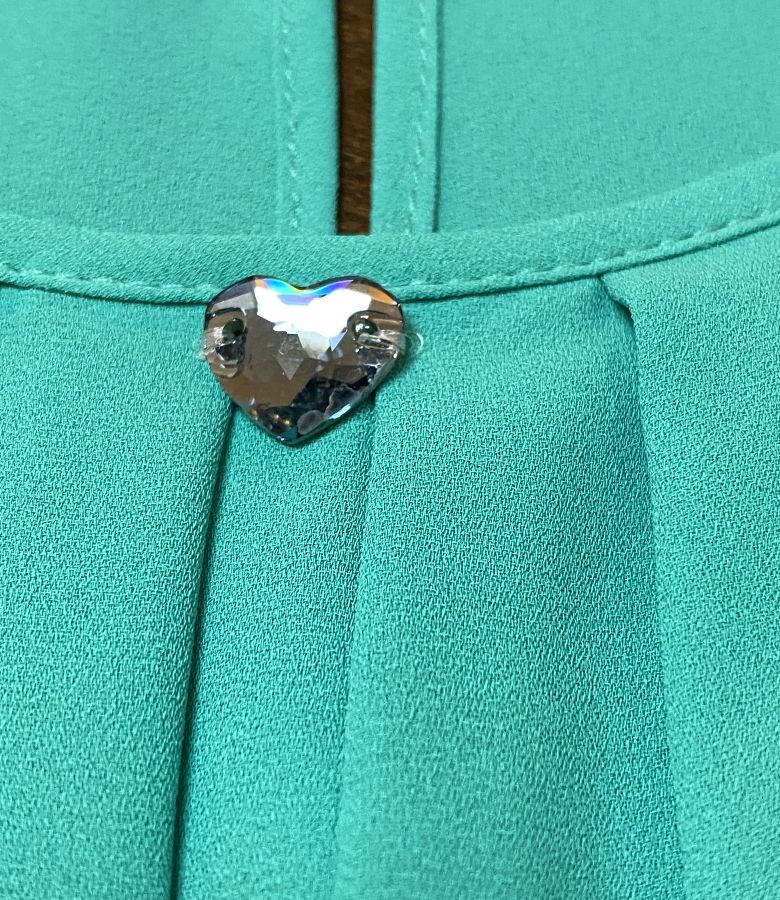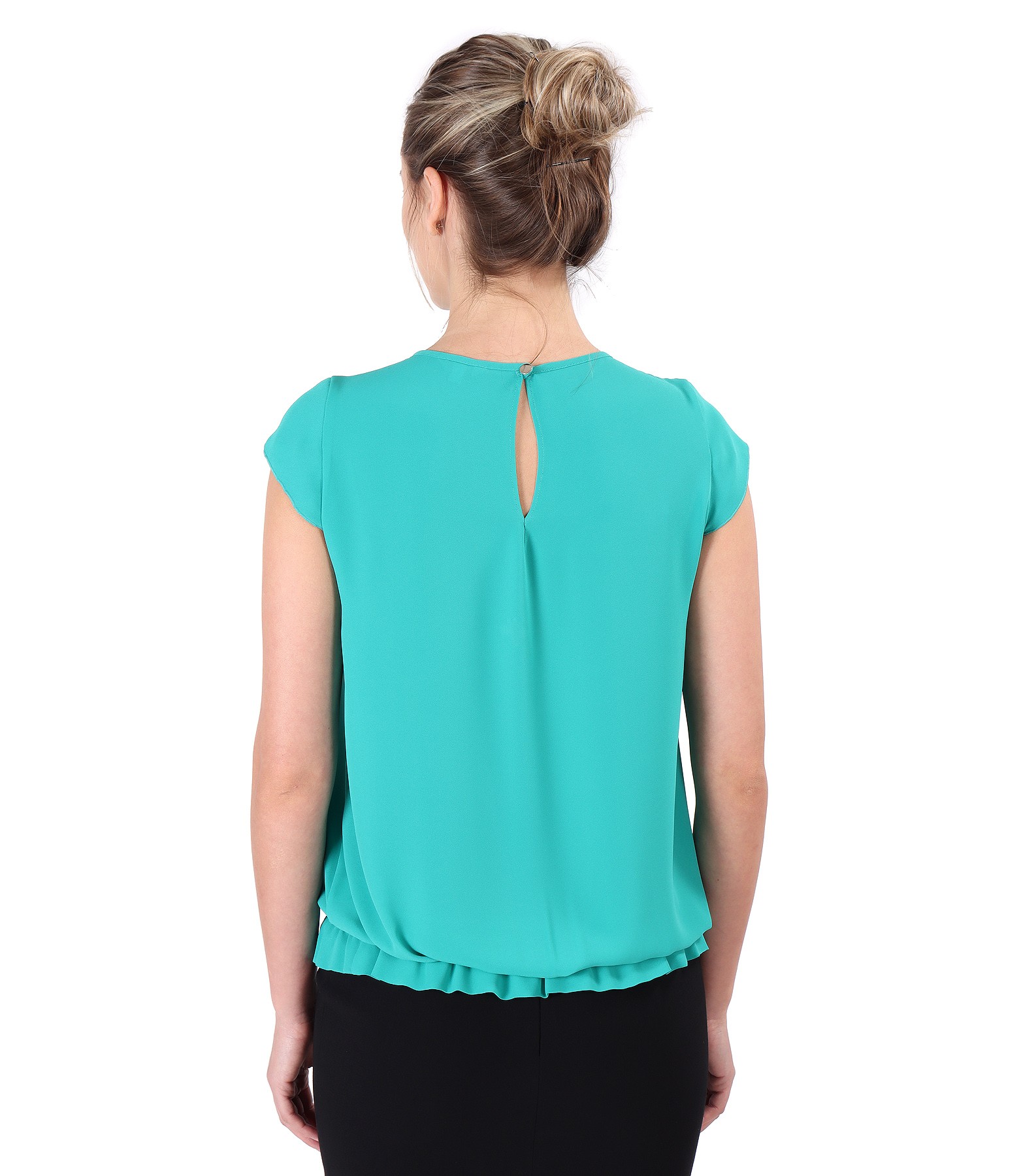 Elegant blouse with front folds, short sleeves, elastic on edges, embellished with crystals on decolletage. Closes with a button on the middle back.