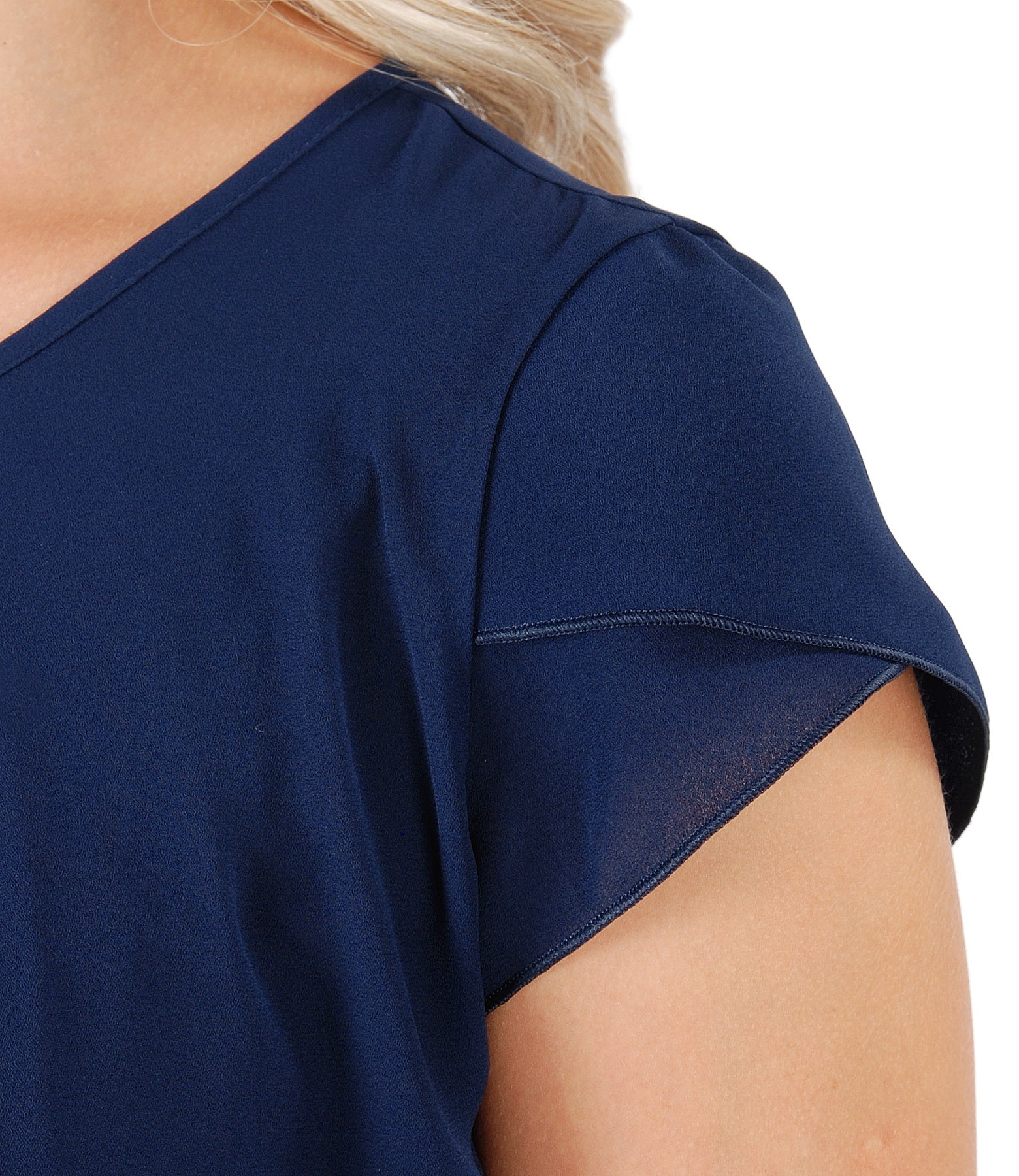 Elegant blouse with front folds, short sleeves, elastic on edges, embellished with crystals on decolletage. Closes with a button on the middle back.