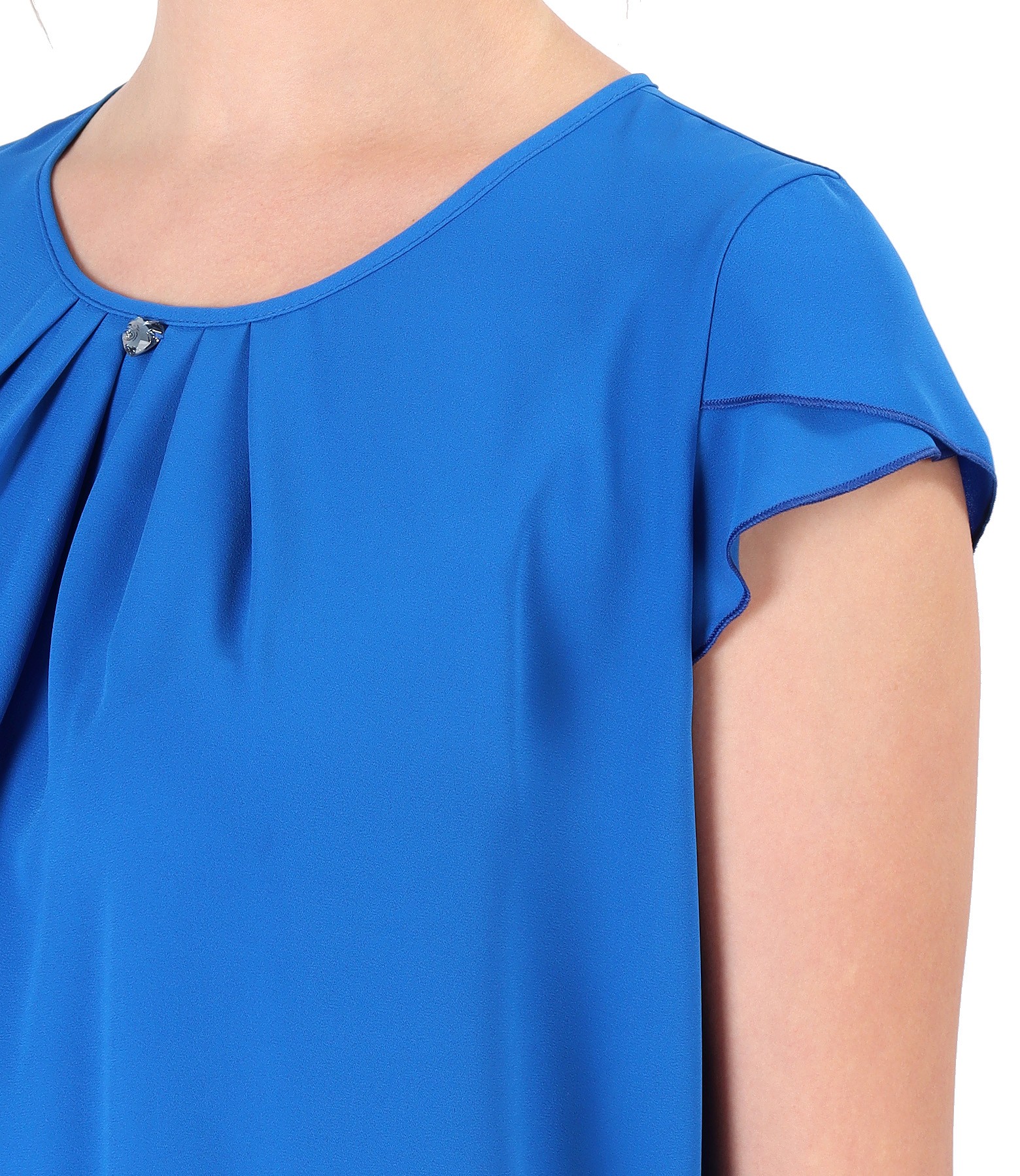 Elegant blouse with front folds, short sleeves, elastic on edges, embellished with crystals on decolletage. Closes with a button on the middle back.
