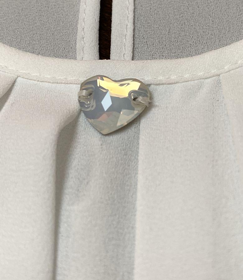 Elegant blouse with front folds, short sleeves, elastic on edges, embellished with crystals on decolletage. Closes with a button on the middle back.
