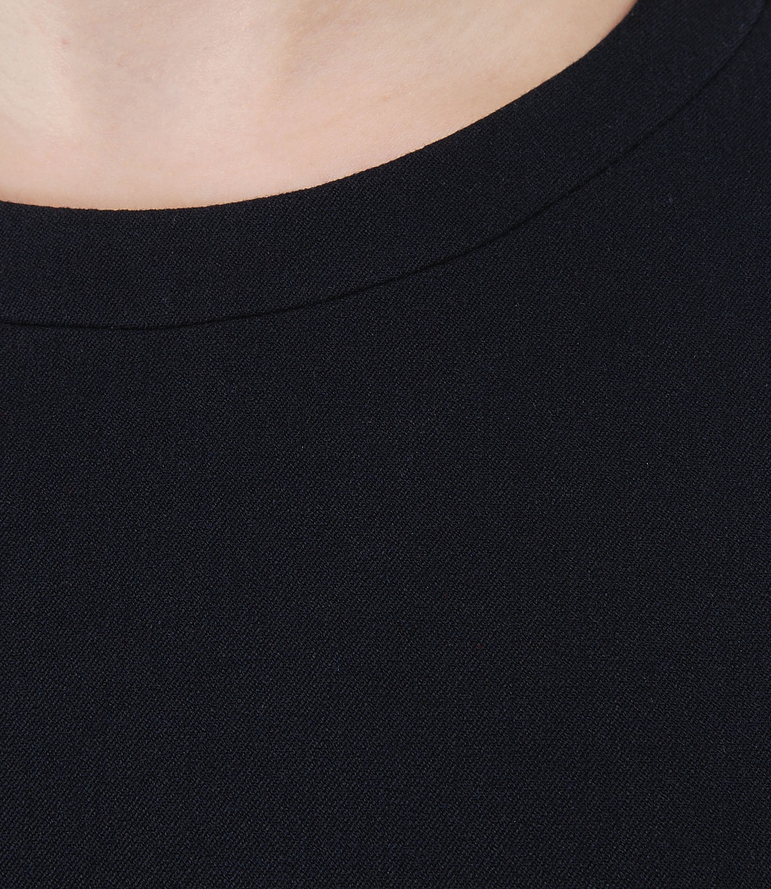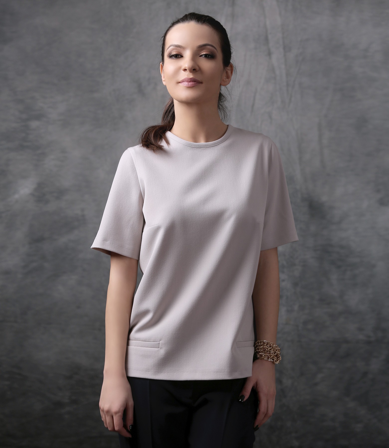 Elegant blouse with short sleeves, round low-cut neck, with front pockets and side slits. Closes with hidden zipper on the middle back.