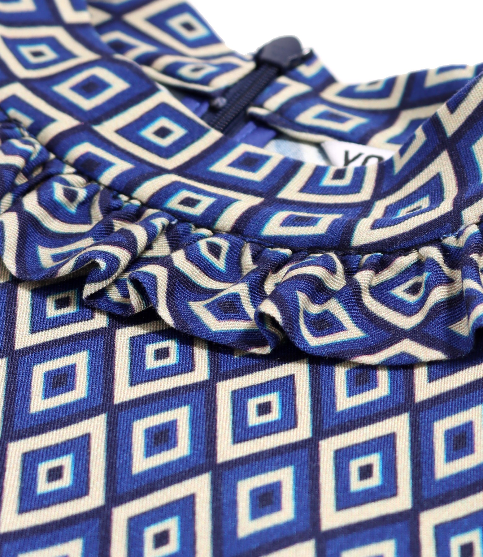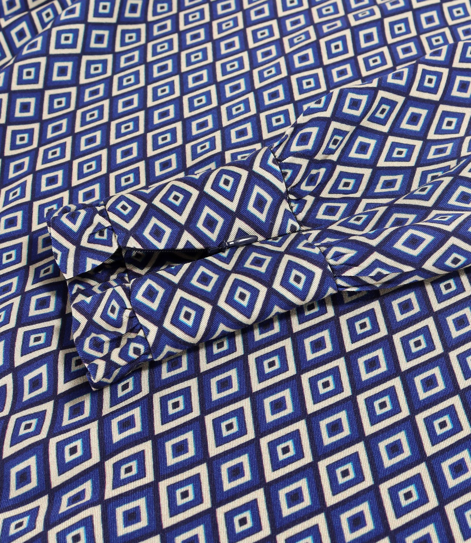 Elegant blouse made of viscose printed with geometric motifs, with long sleeves gathered at the end with zipped cuffs. It closes with a zipper in the middle of the back.