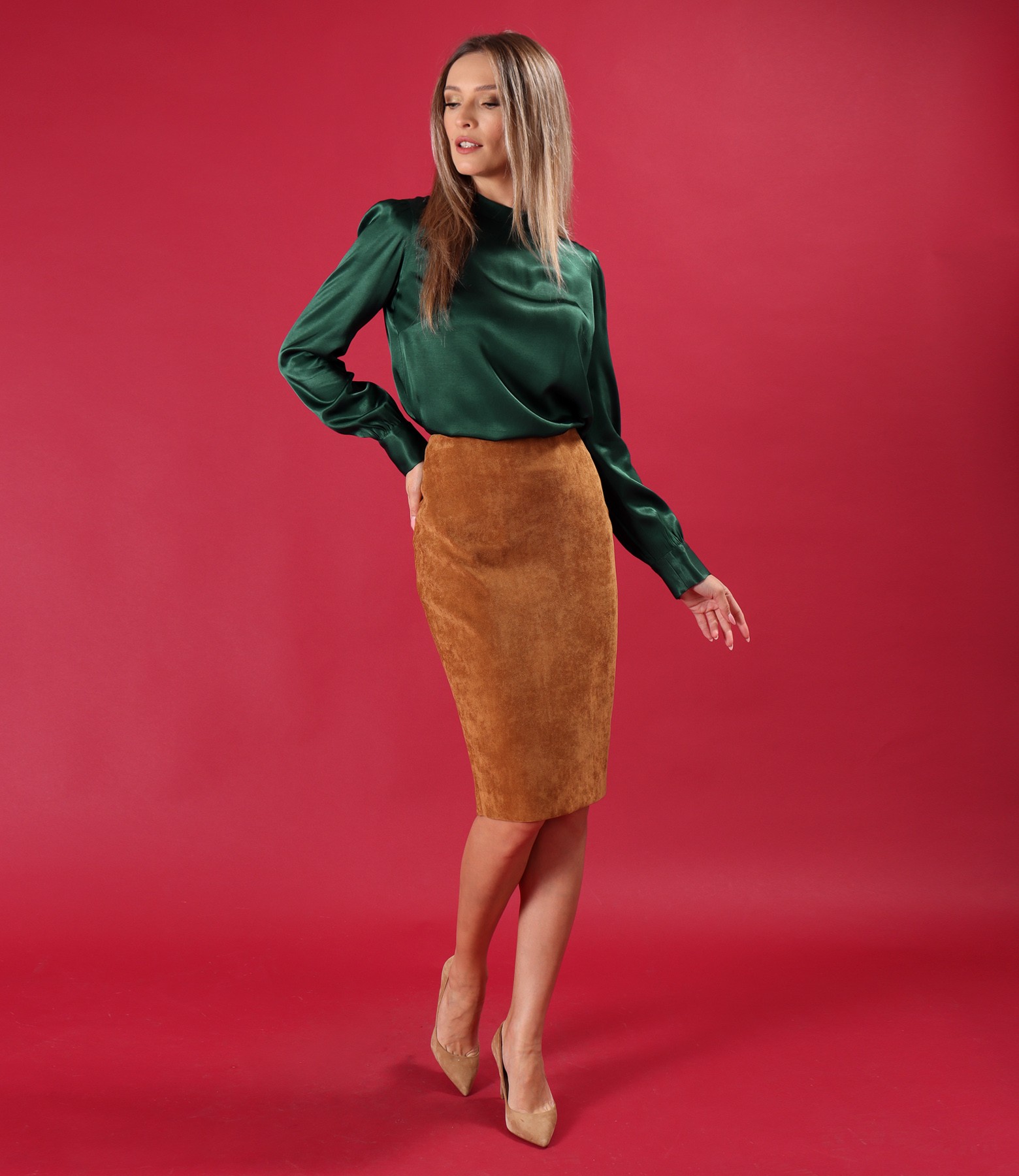 Elegant blouse with long sleeves made of viscose satin (emerald green), size
