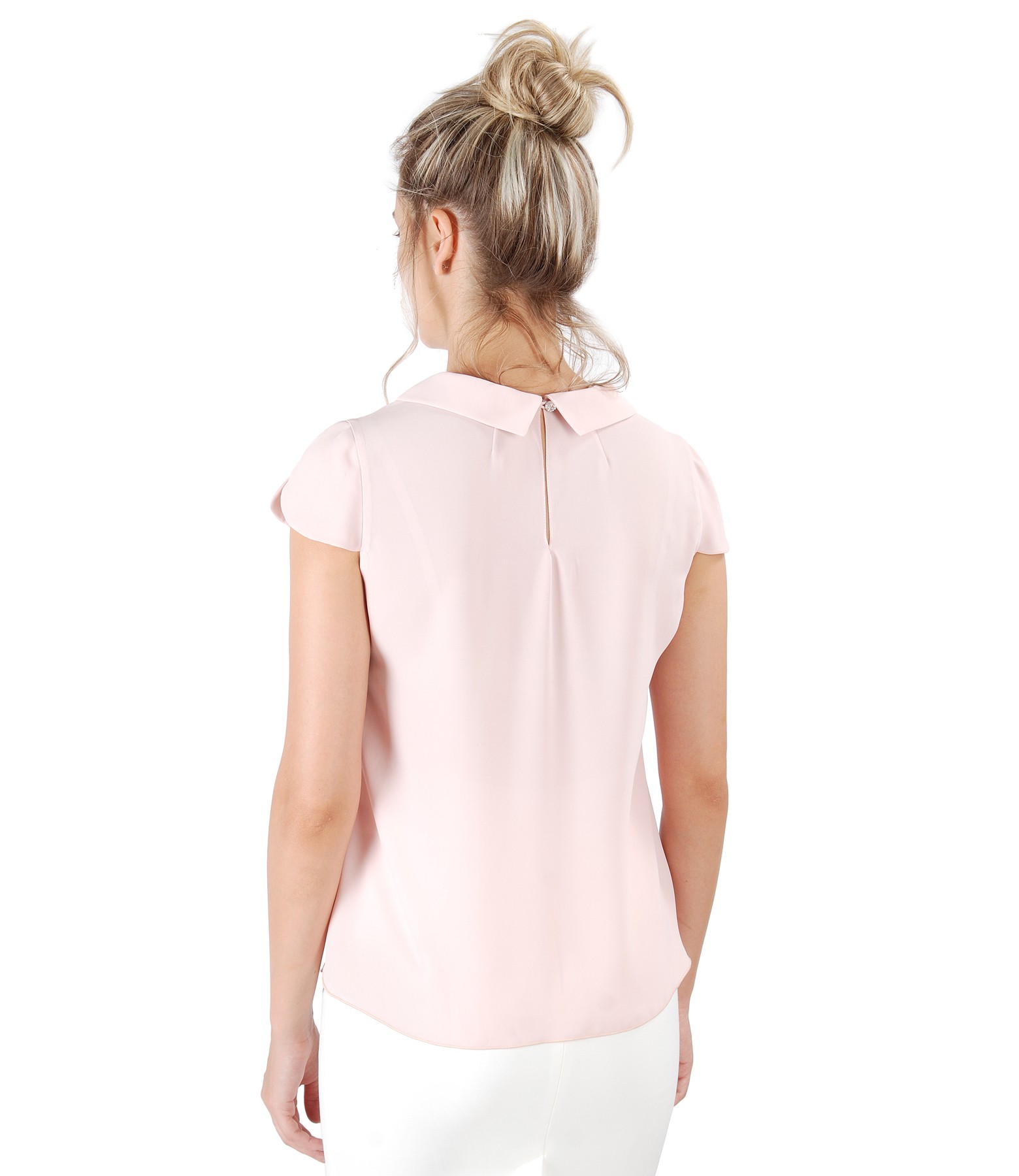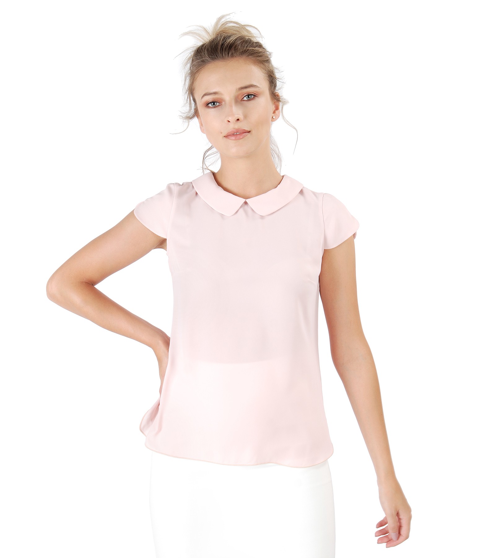 Elegant blouse with round collar and short sleeves. Closes with a button on the middle back.