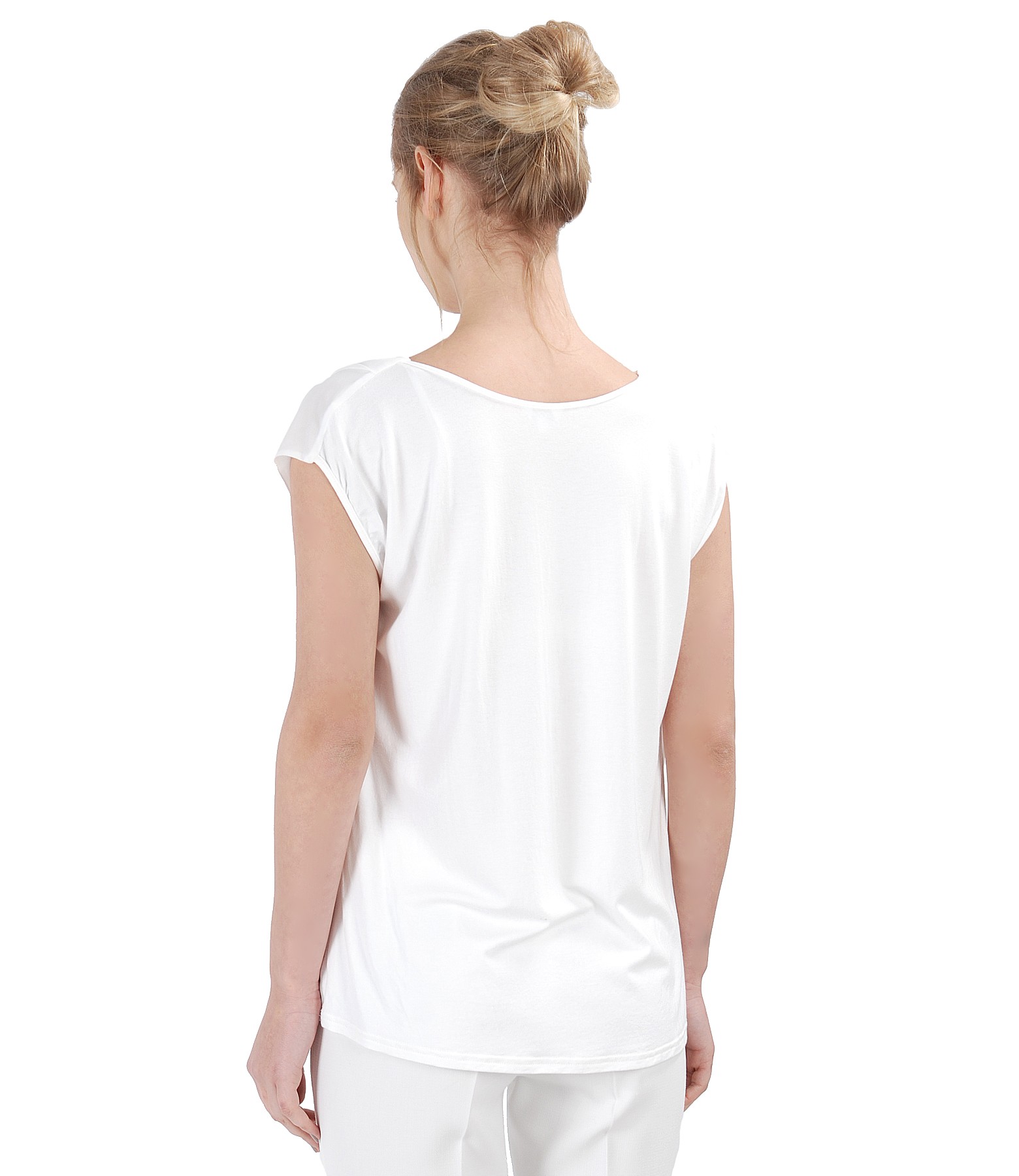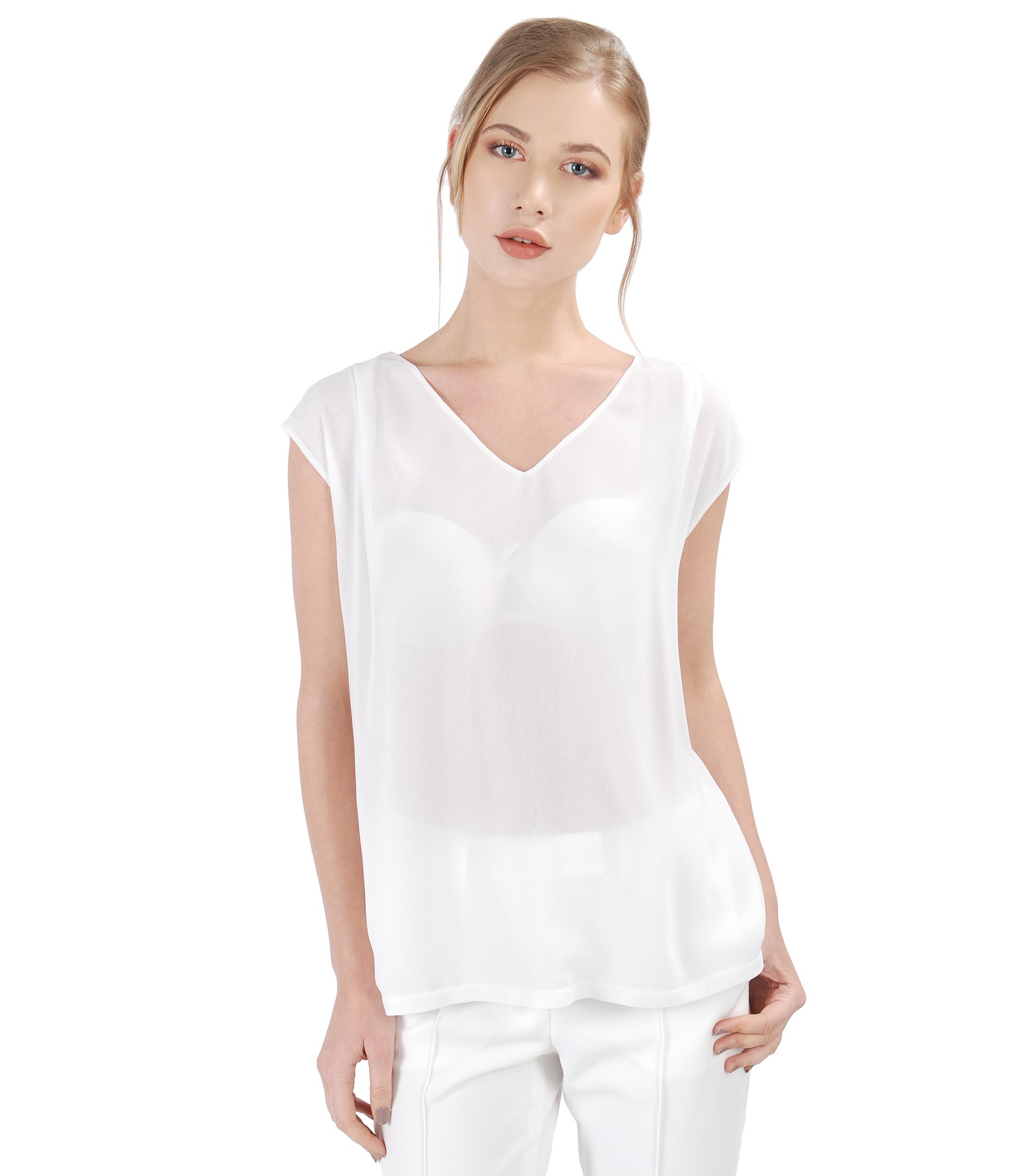 Elegant blouse with veil front, elastic jersey back and V low-cut neck.