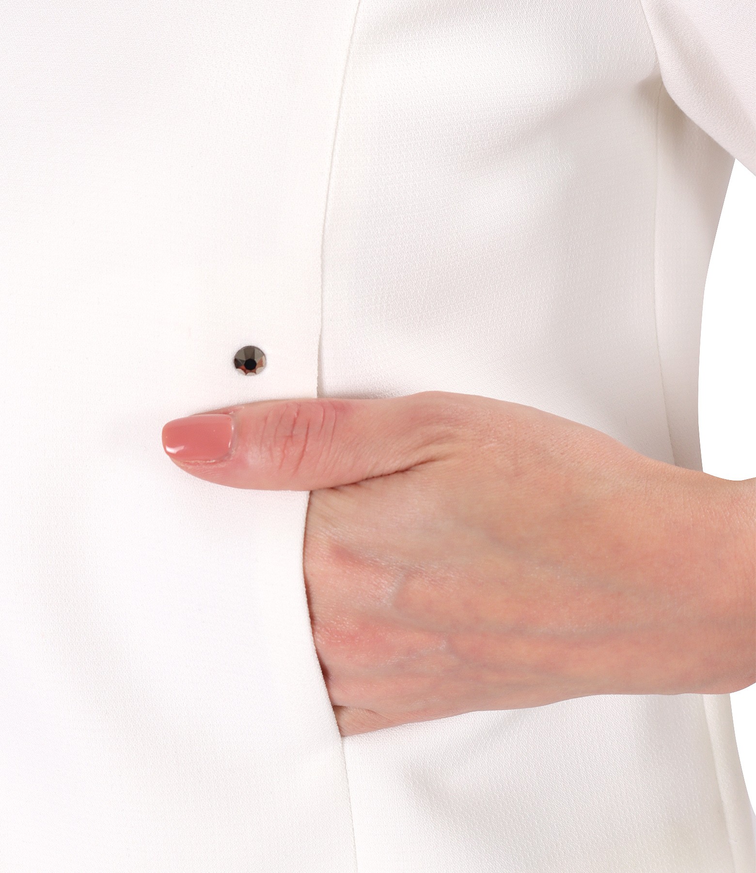 Elegant bolero, with 3/4 sleeves, padded, with vertical hidden pockets, tunic collar, embellished with crystals from on decolletage. Closes with 5 front staples pairs.