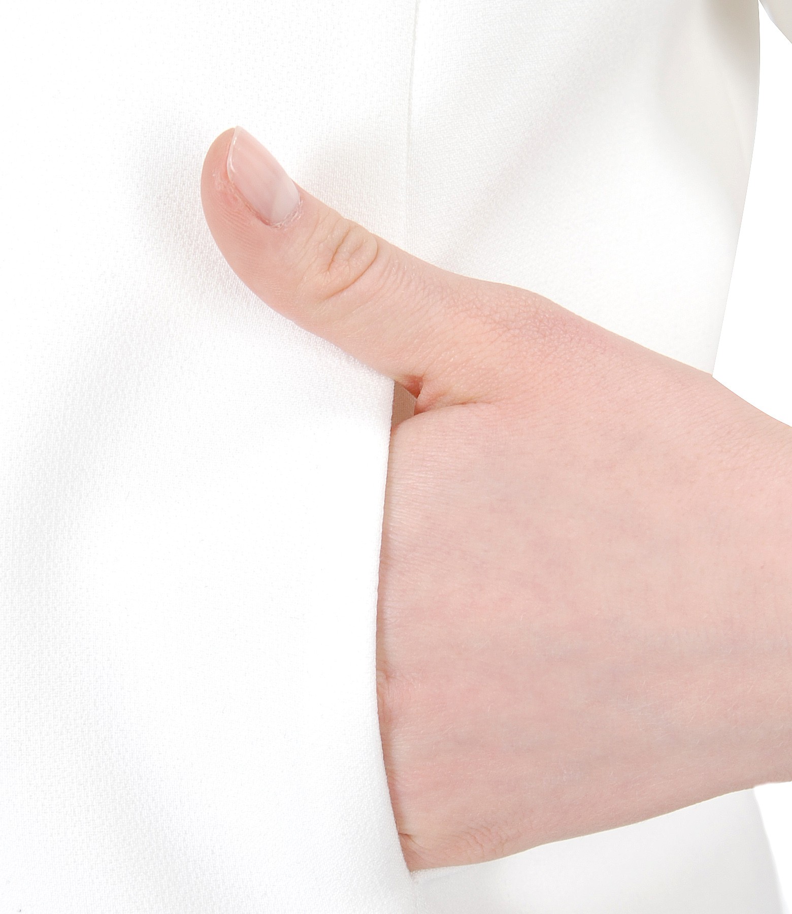 Elegant bolero, with 3/4 sleeves, padded, with vertical hidden pockets, tunic collar, embellished with crystals on decolletage. Closes with 5 front staples pairs.
