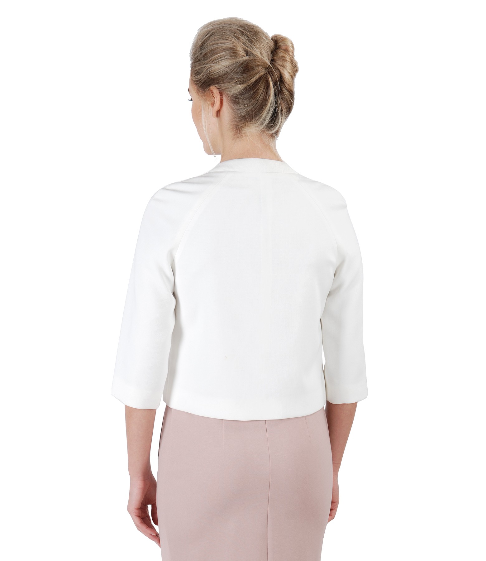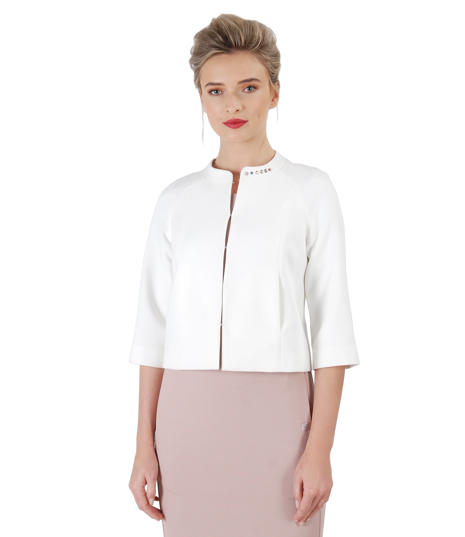 Elegant bolero, 3/4 sleeves, padded, with hidden vertical pockets, tunic collar, embellished with crystals on decolletage. Closes with 5 front staples.