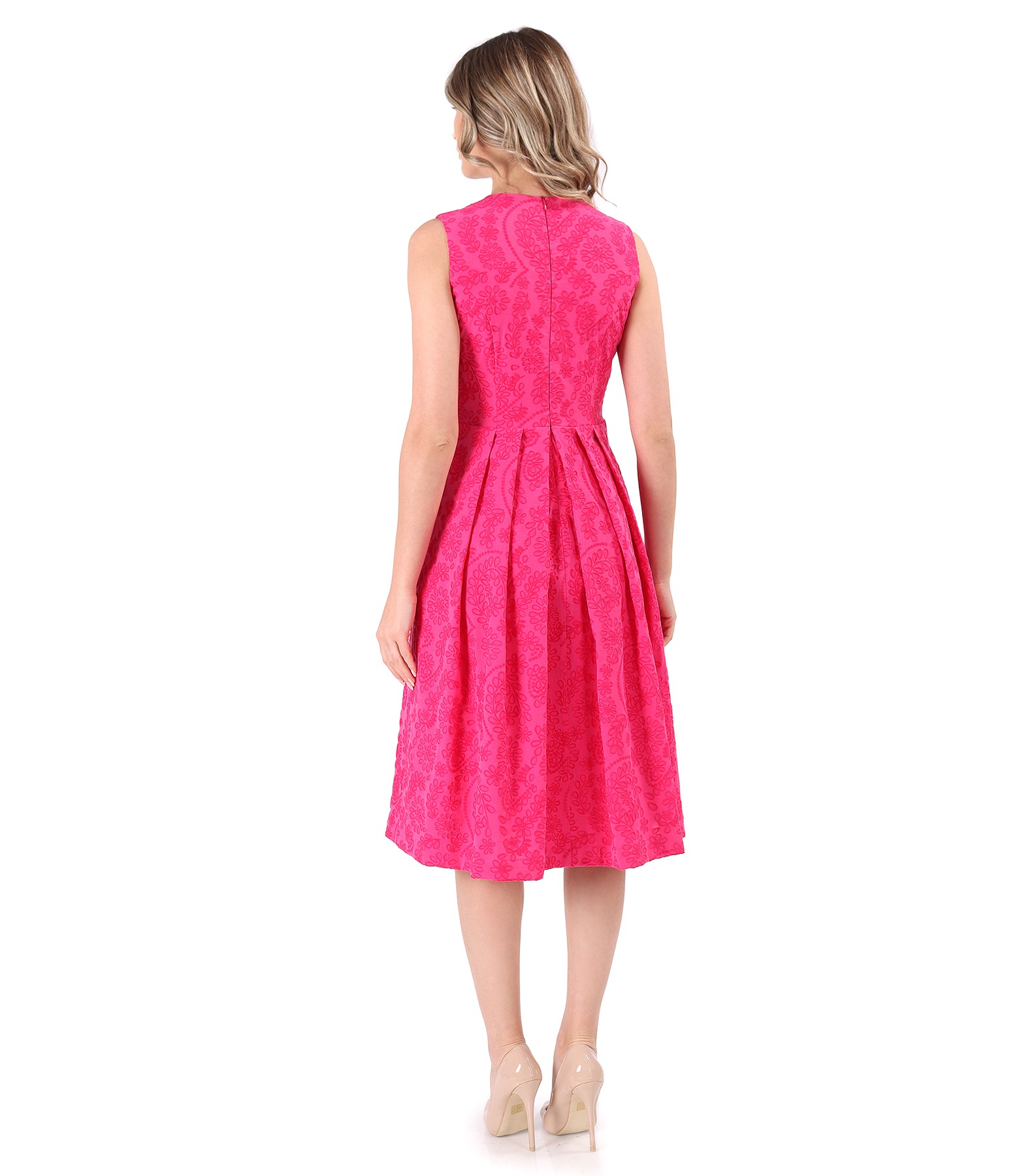 Elegant tencell brocade dress with cotton, floral motifs, padded with viscose, sleeveless, with side pockets and pleats on the front and back. It closes with a zipper hidden at the neckline and in the middle of the back.