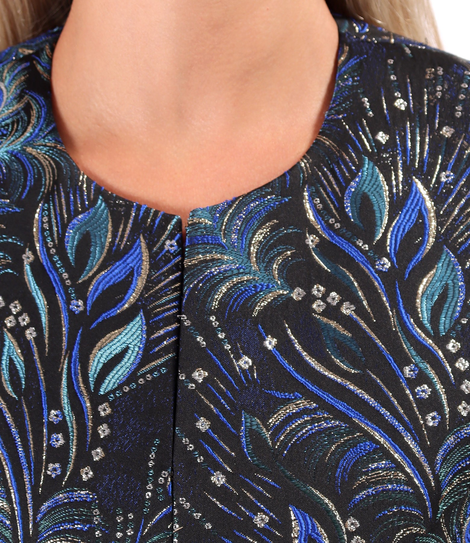 Elegant brocade jacket with metallic threads and floral motifs, lined, collarless, and with long sleeves. It fastens at the front with four buttons up to the bust line.