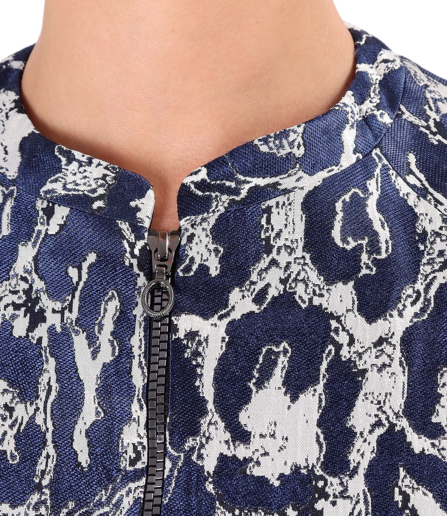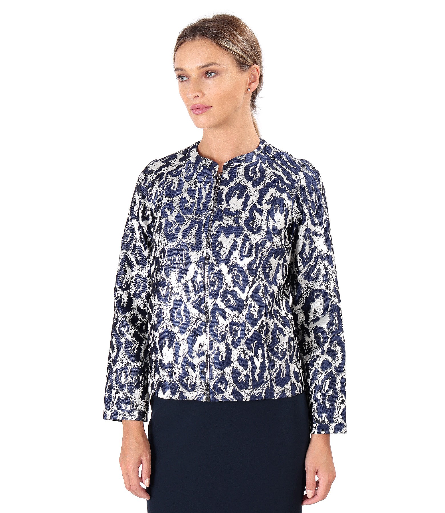 Elegant brocade jacket with metallic thread and geometric motifs, padded, with sleeves and vertical side pockets. Closes with a zipper in the middle of the front.