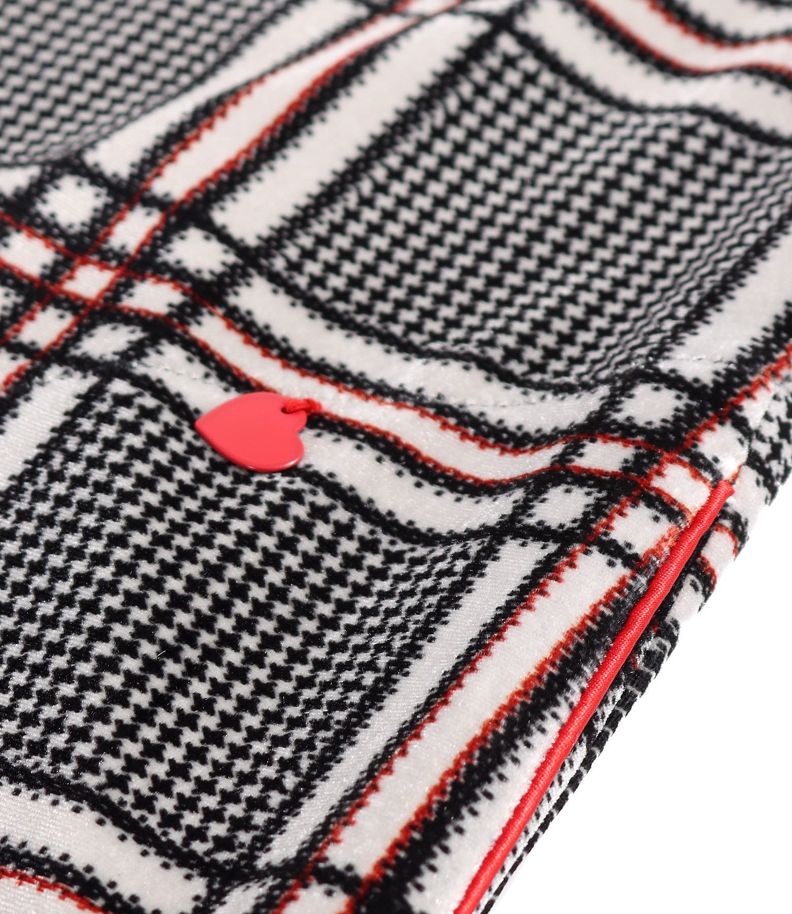 Elegant dress made of checkered elastic velvet, with 3/4 sleeves, deep V-neckline, and side pockets.
