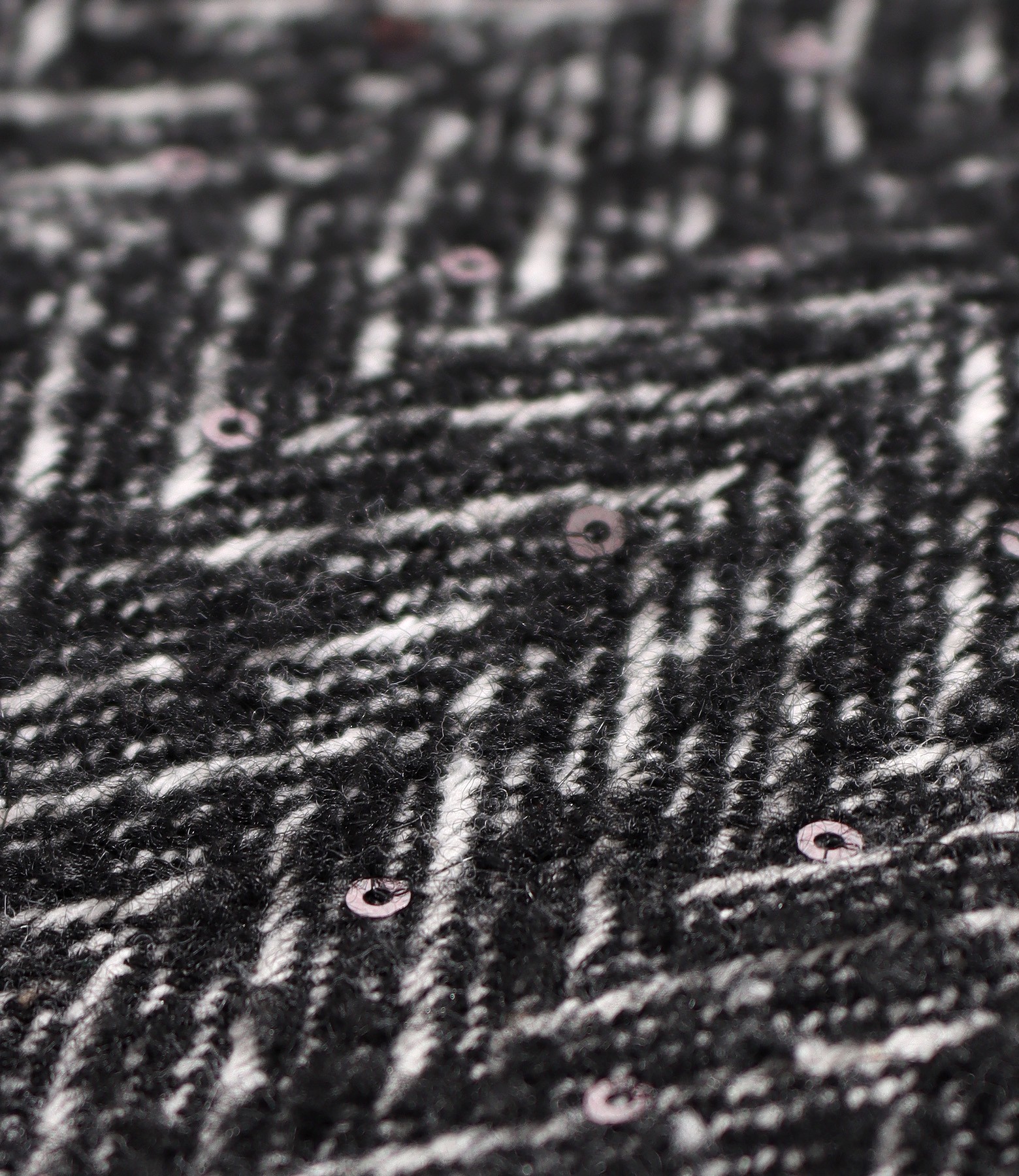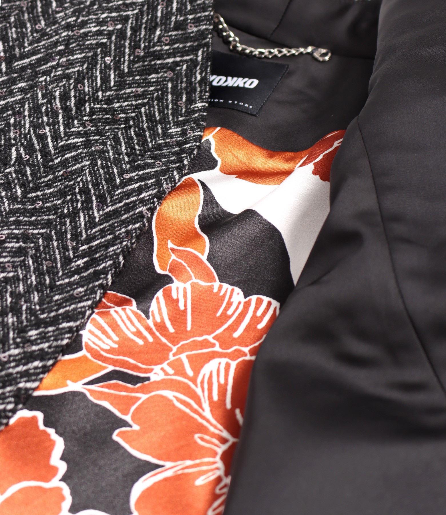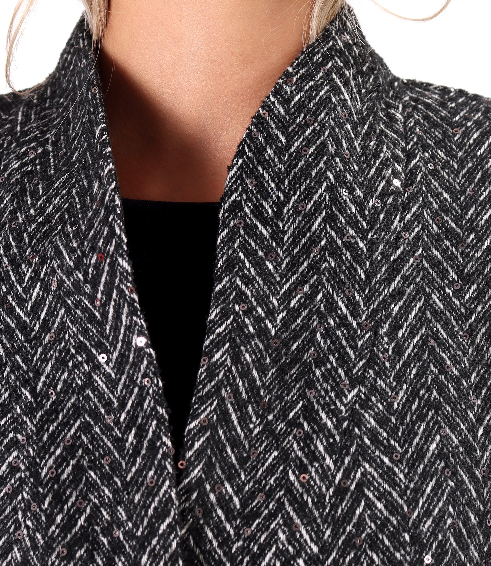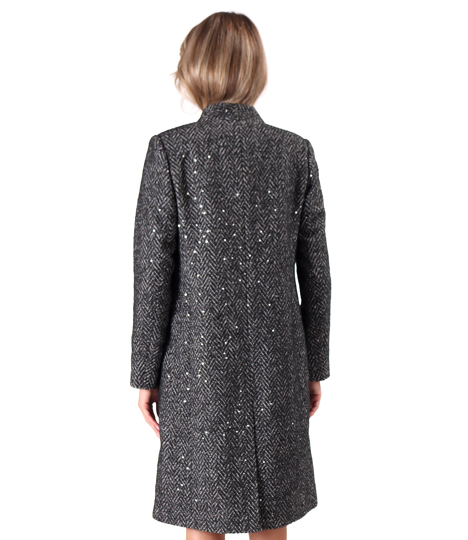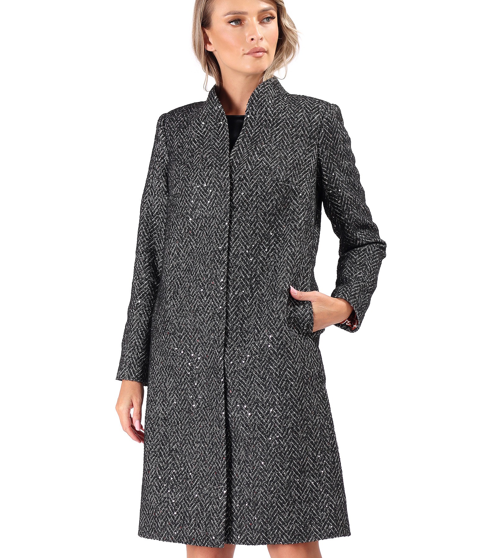 Elegant coat made of sequin-embellished fabric, featuring a tunic collar, side pockets, and a back vent. It closes at the front with four metal snap fasteners.