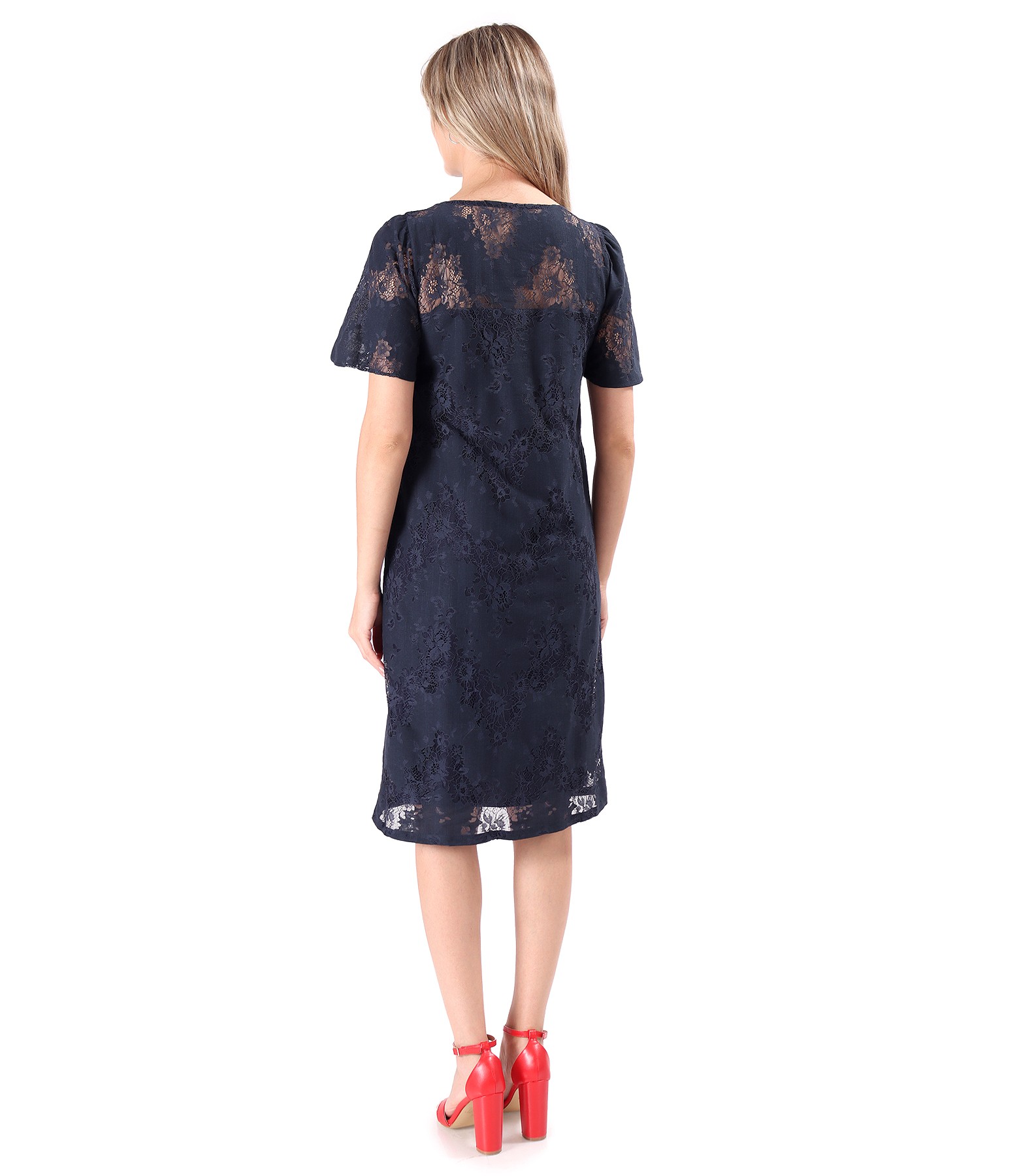 Elegant dress made of cotton lace with floral motifs, doubled with viscose, with wide short sleeves and a round neckline.