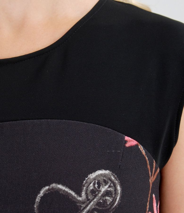 Lined dress from elastic fabric with fallen shoulders and elastic fabric insertion with digital front and back print. Middle-back metalic zip fastening.