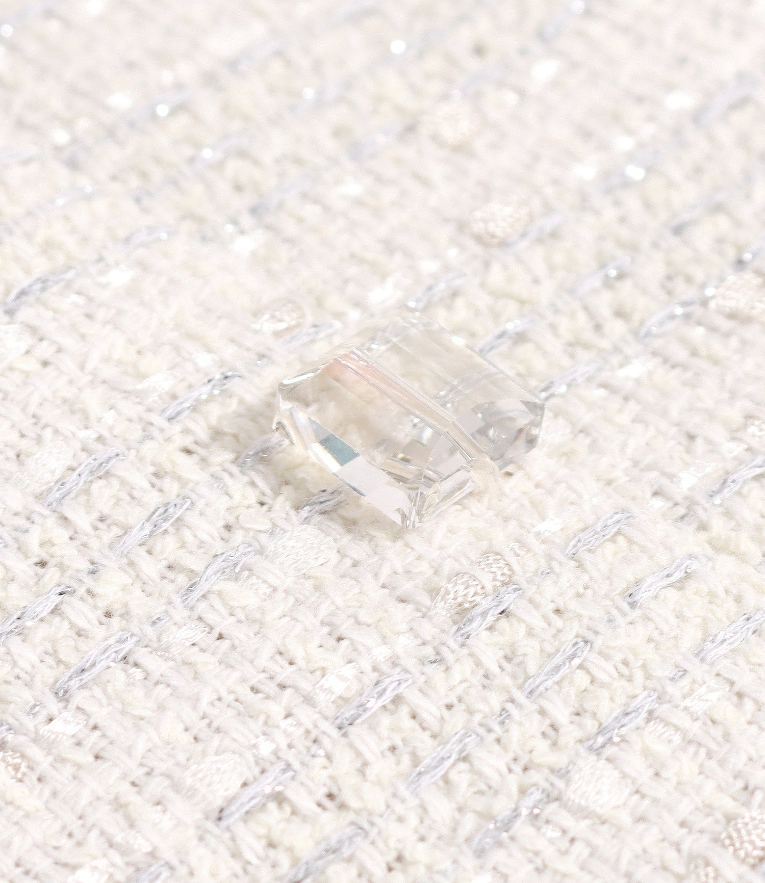 Elegant dress made of cotton and silver thread, with short, wing-type sleeves, a round neckline, and a crystal at the waist. The dress has fringes at the end of the sleeves and at the bottom. It closes with a zipper at the center back.