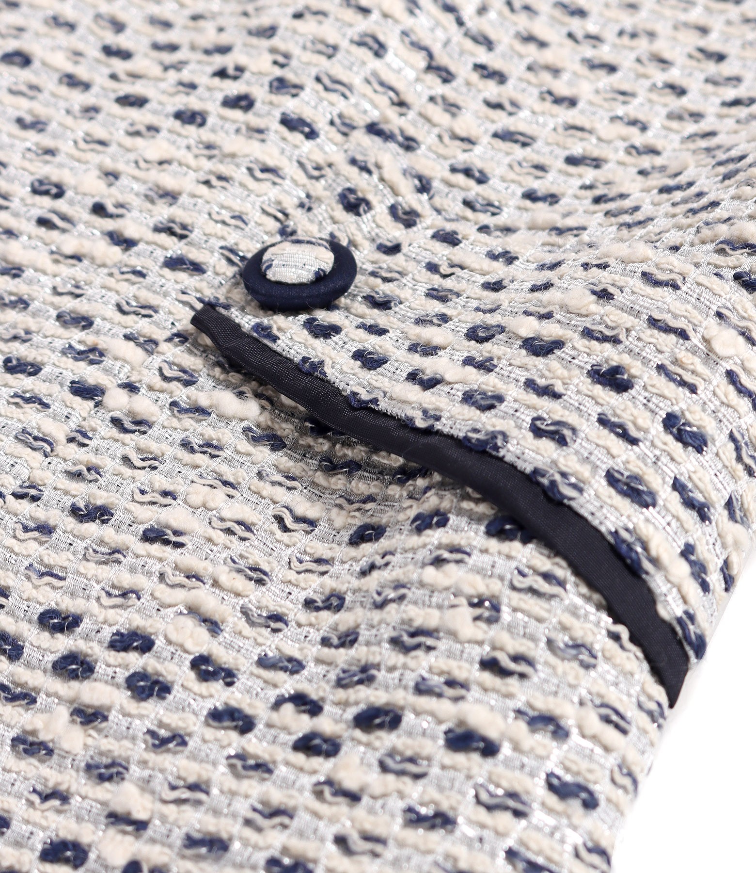 Elegant dress made of cotton curls with silver metallic thread, padded, with short sleeves, with a round neckline and flaps with a decorative button at the waist. It closes with a zipper on the middle back.