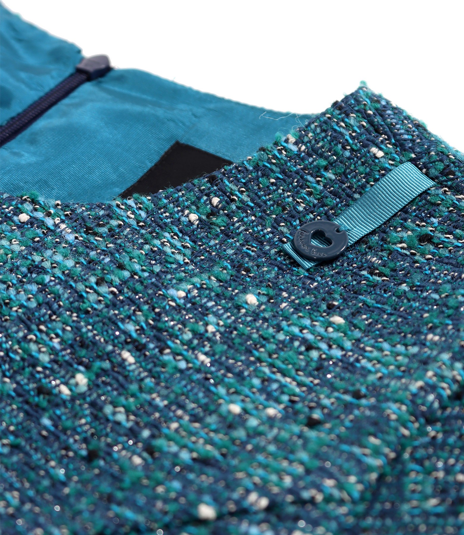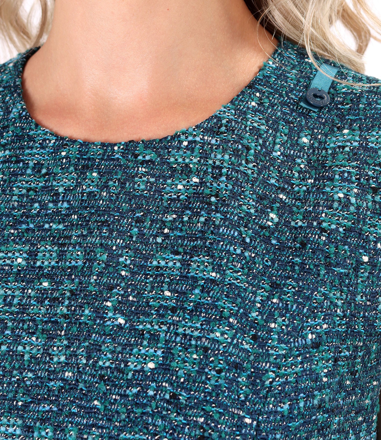 Elegant dress made of curls with wool and lurex thread, padded, with short sleeves and a round collar with button. It closes with a zipper on the middle back.