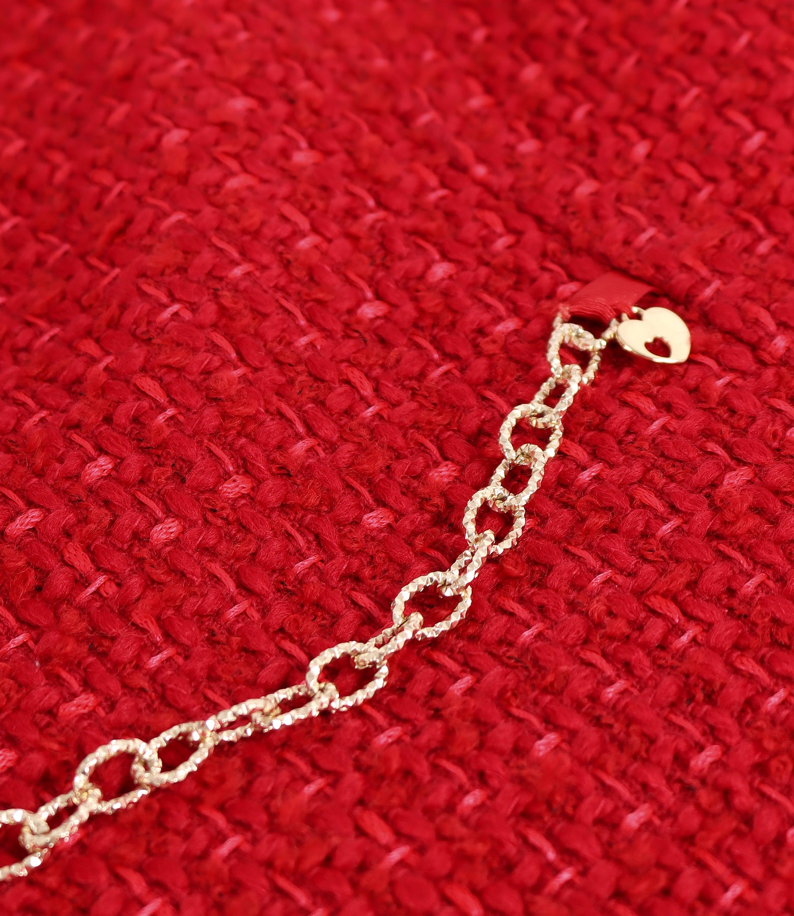 Elegant dress made of curls with wool and viscose, padded, with a round neckline, 3/4 sleeves, and decorative golden chain at the waist. It closes with a hidden zipper in the middle of the back.