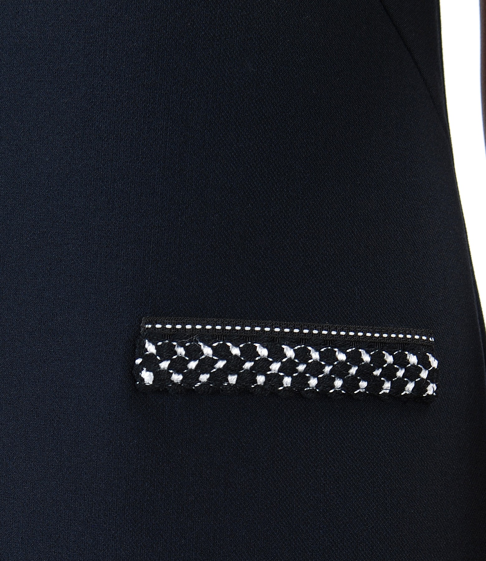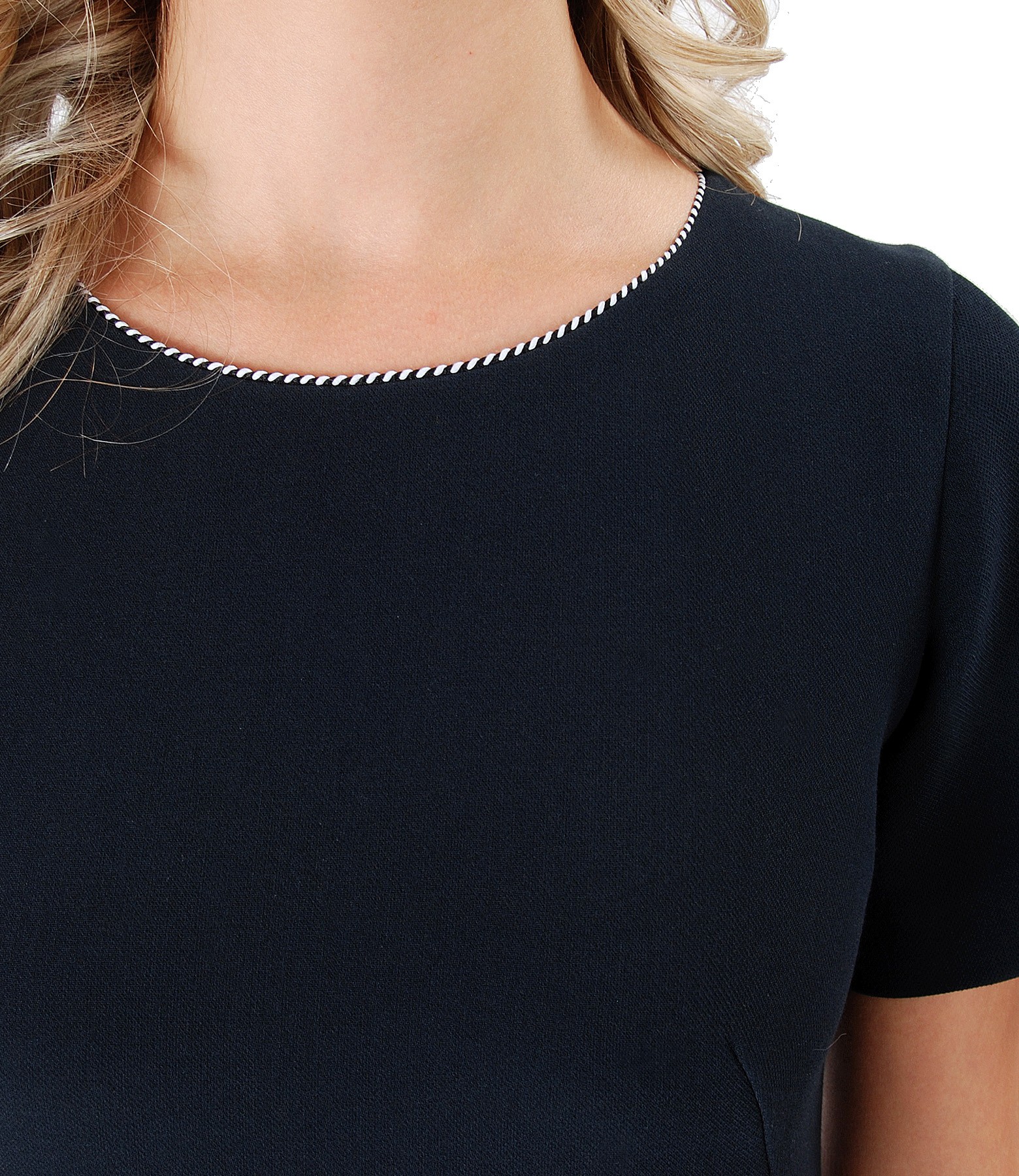 An elegant dress made of thick elastic fabric, padded, A shape, accessorized in contrast with fake flaps and low-cut neck passepoil. Closes with hidden zipper on the middle back.