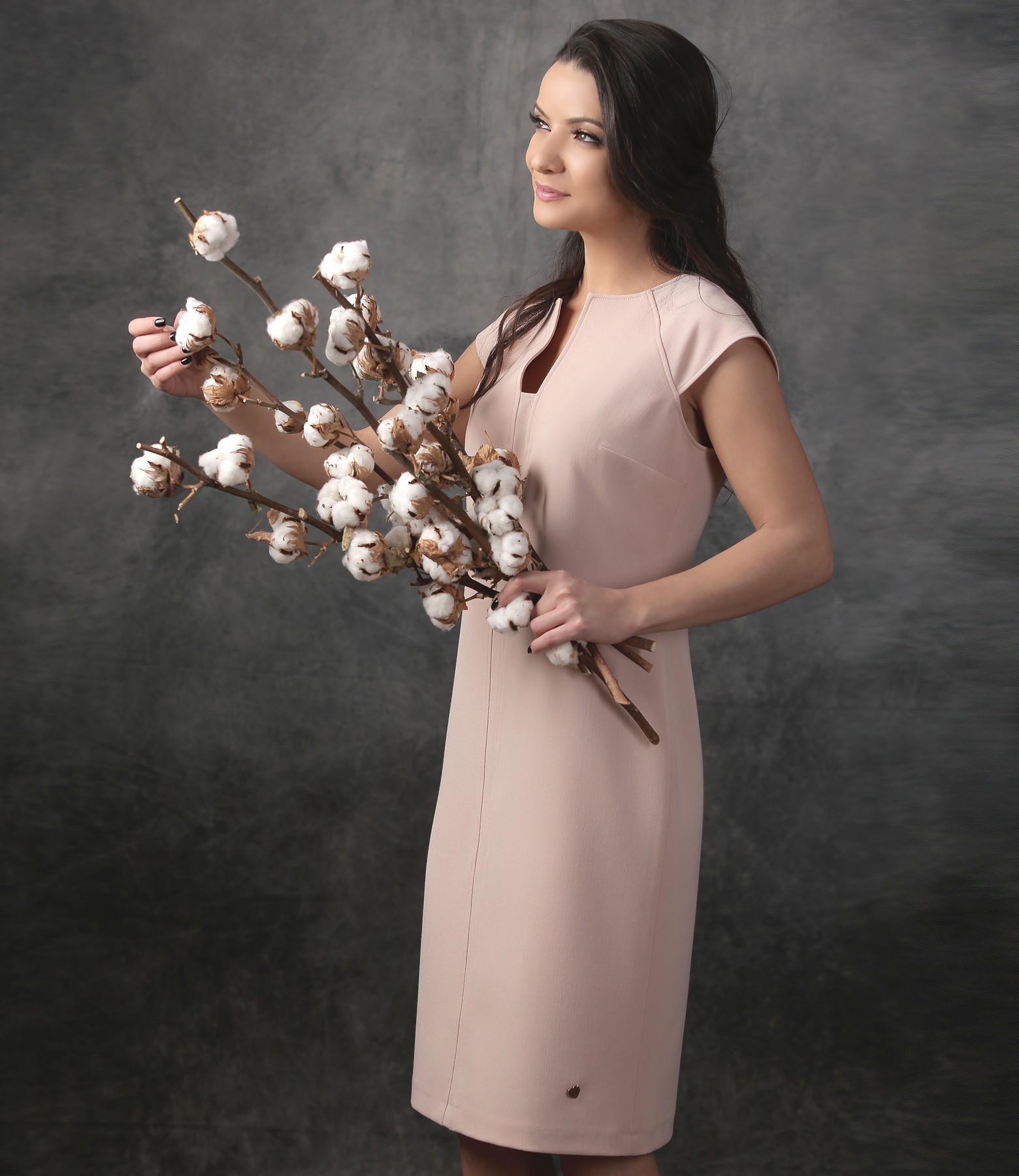 Elegant dress, inlay, made of elastic fabric, with draping sleeves. Closes with hidden zipper on the middle back.