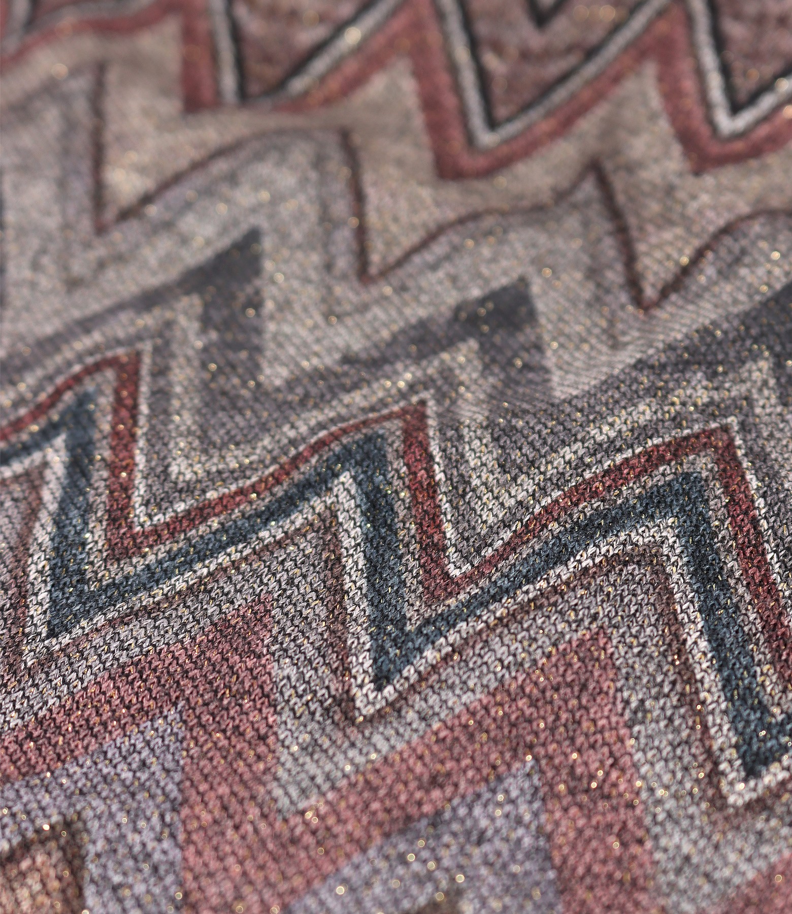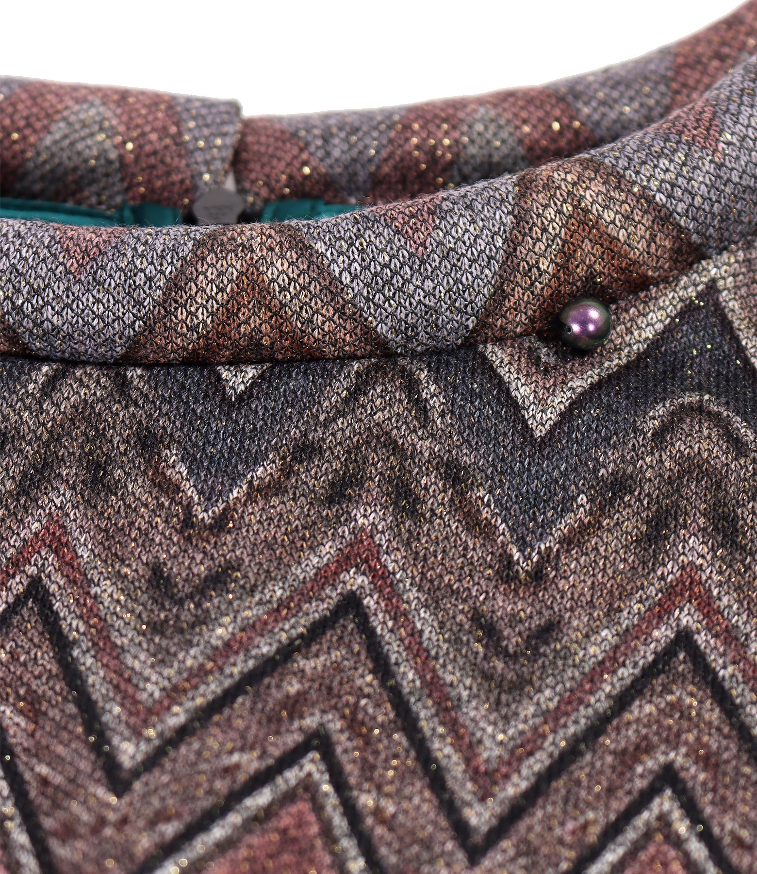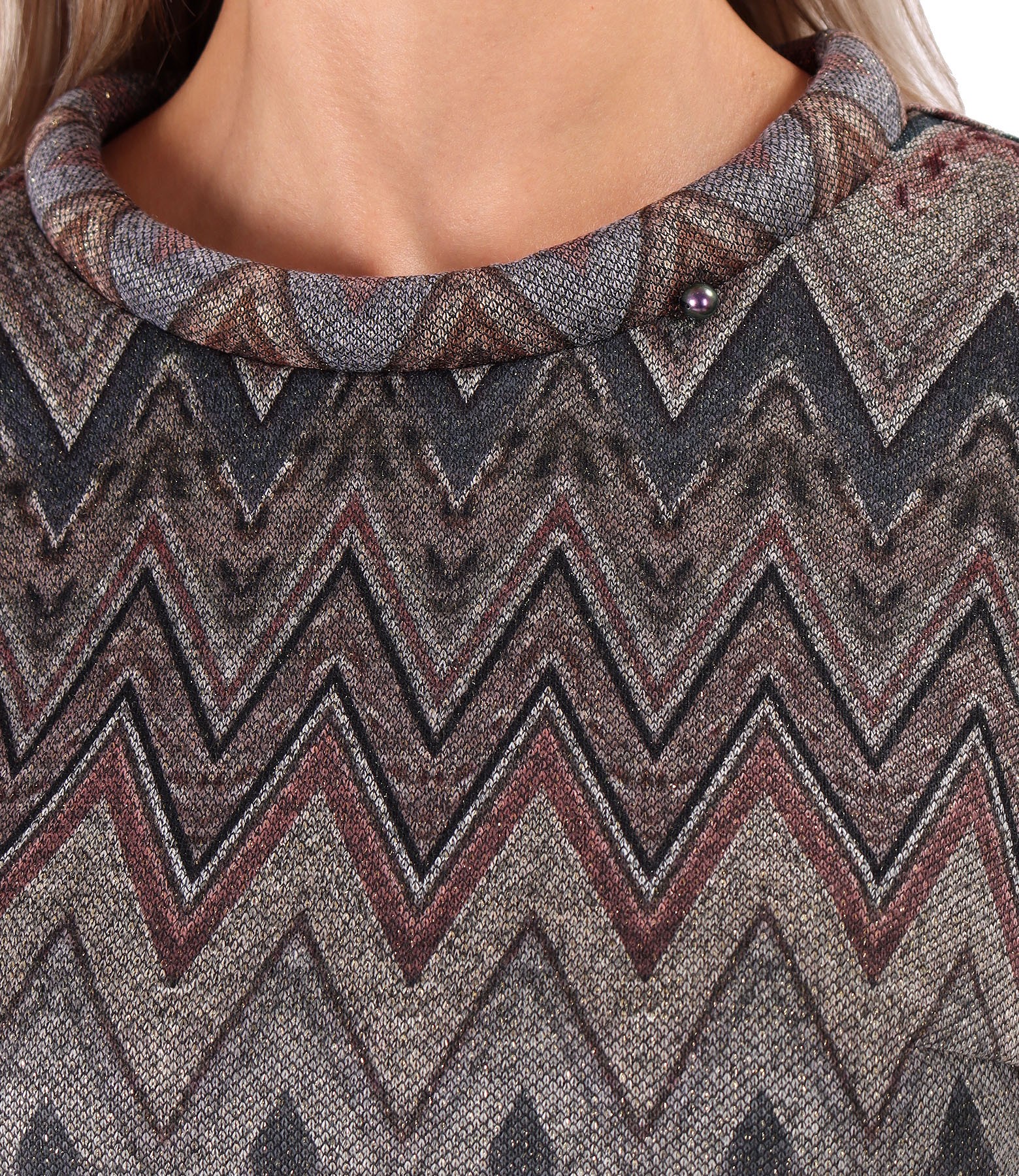 Elegant dress made of elastic fabric with lurex thread, unlined, with 3/4 sleeves, side pockets, tubular collar with pearl sewn on the front. It closes with a hidden zipper in the middle of the back.