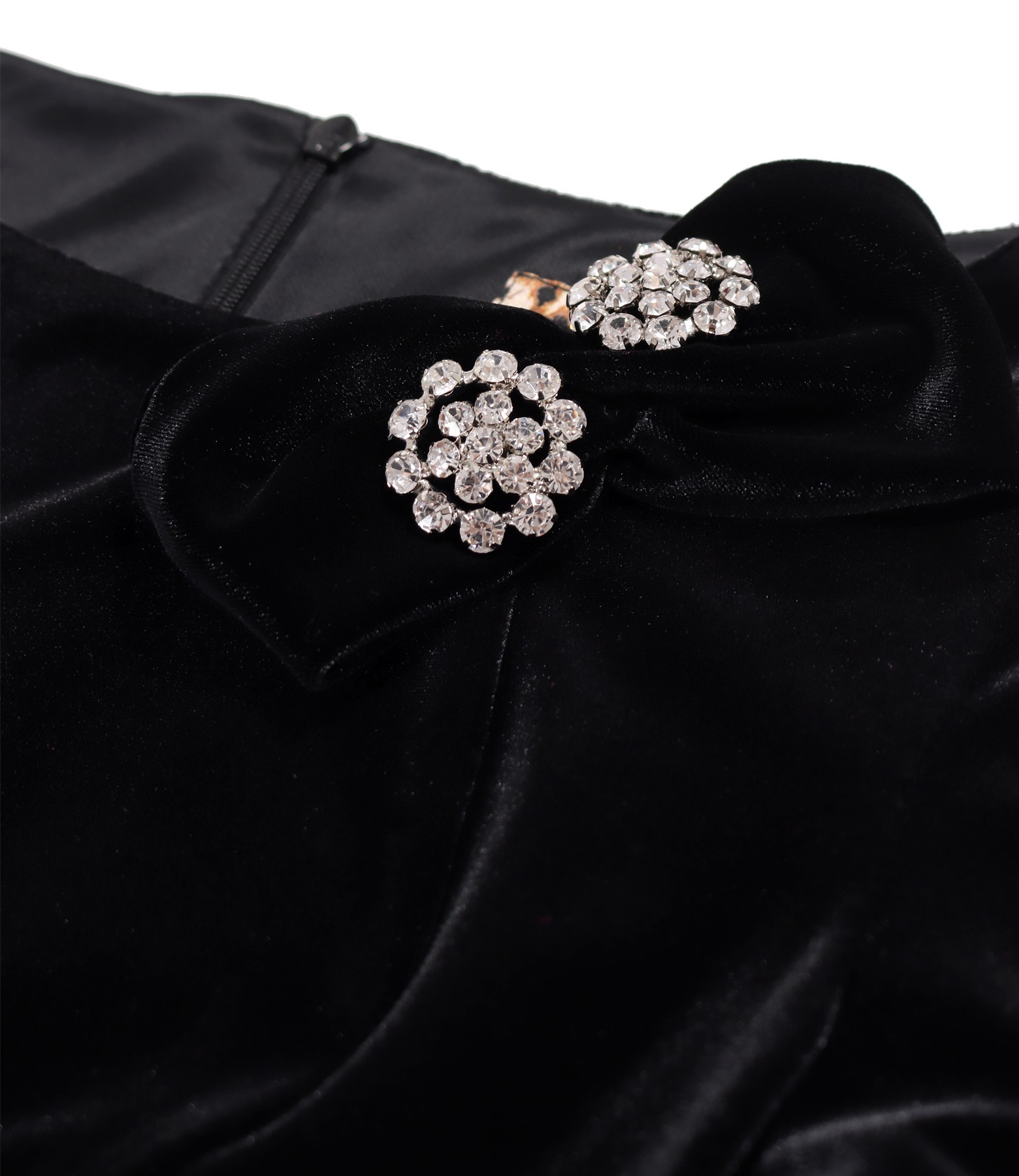 Elegant dress made of elastic velvet with crystals brooch (Black), size