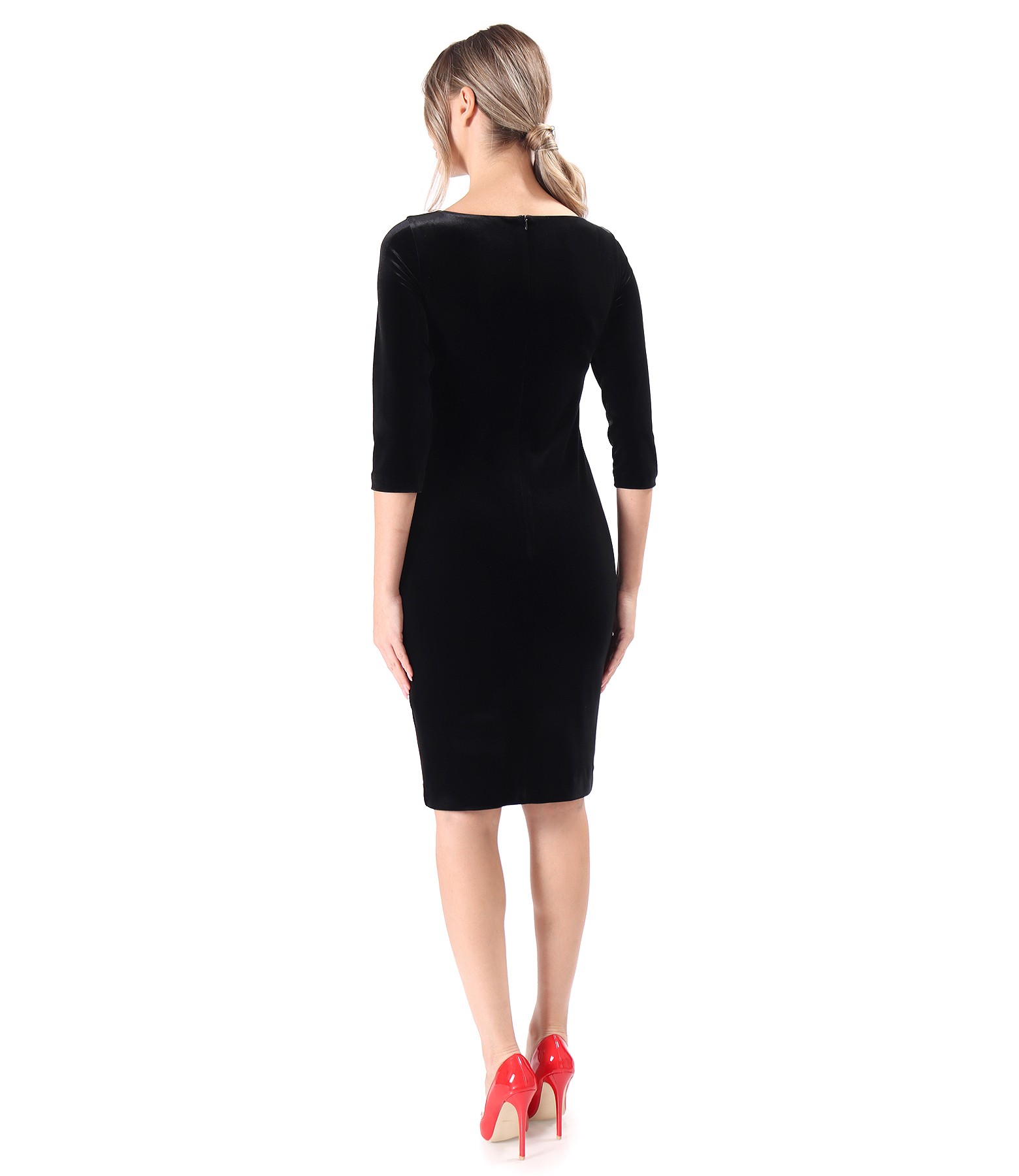Elegant dress made of elastic velvet with a detachable brooch, with crystals at the neckline, lined, and 3/4 sleeves. Closes with a hidden zipper in the middle of the back.