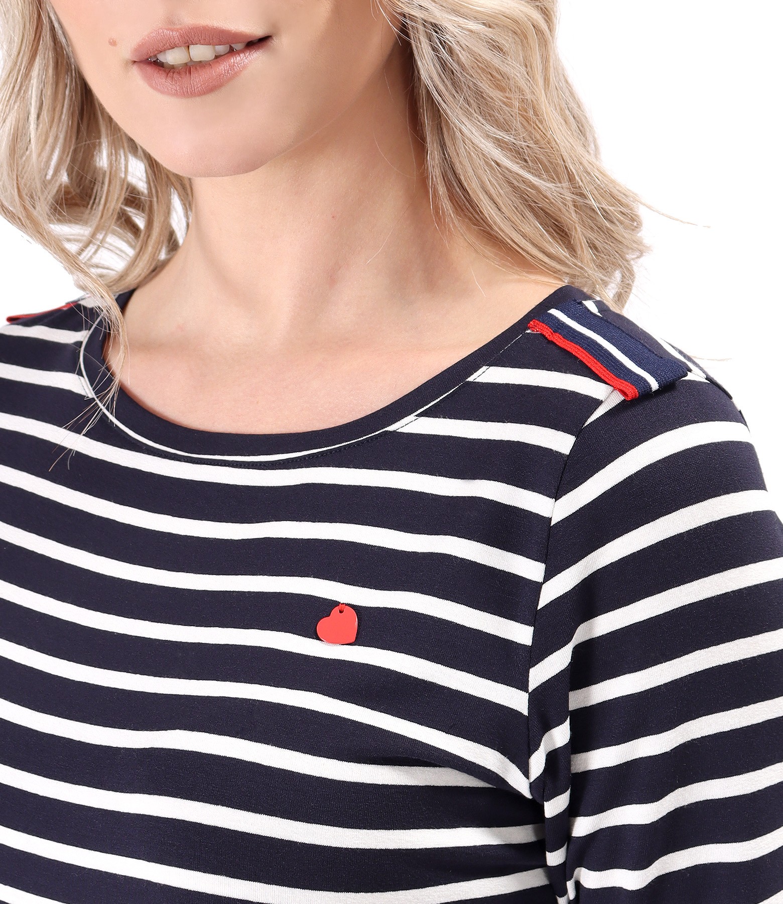 Elegant dress made of elastic viscose jersey with stripes, unlined, with 3/4 sleeves, a round neckline with a decorative metallic heart, and a multicolored decorative band on the shoulders. It has no closing system.